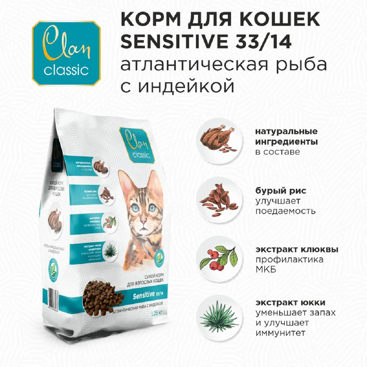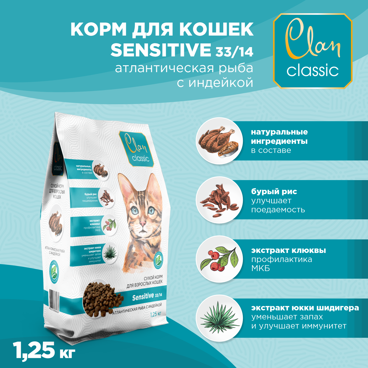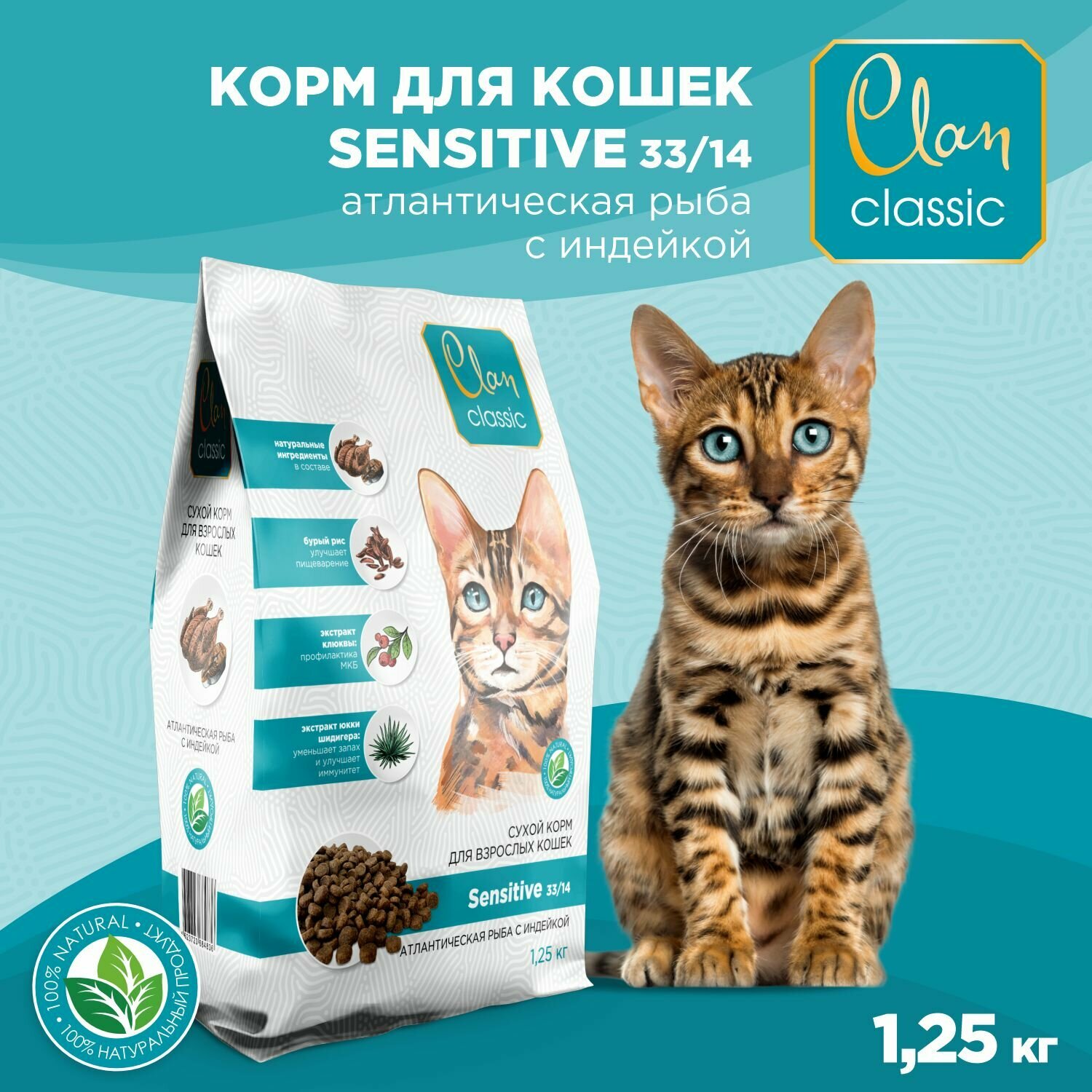 Корм CLAN CLASSIC Sensitive 33/14 для кошек чувствительным пищеварением, атлантическая рыба/индейка 1,25 кг