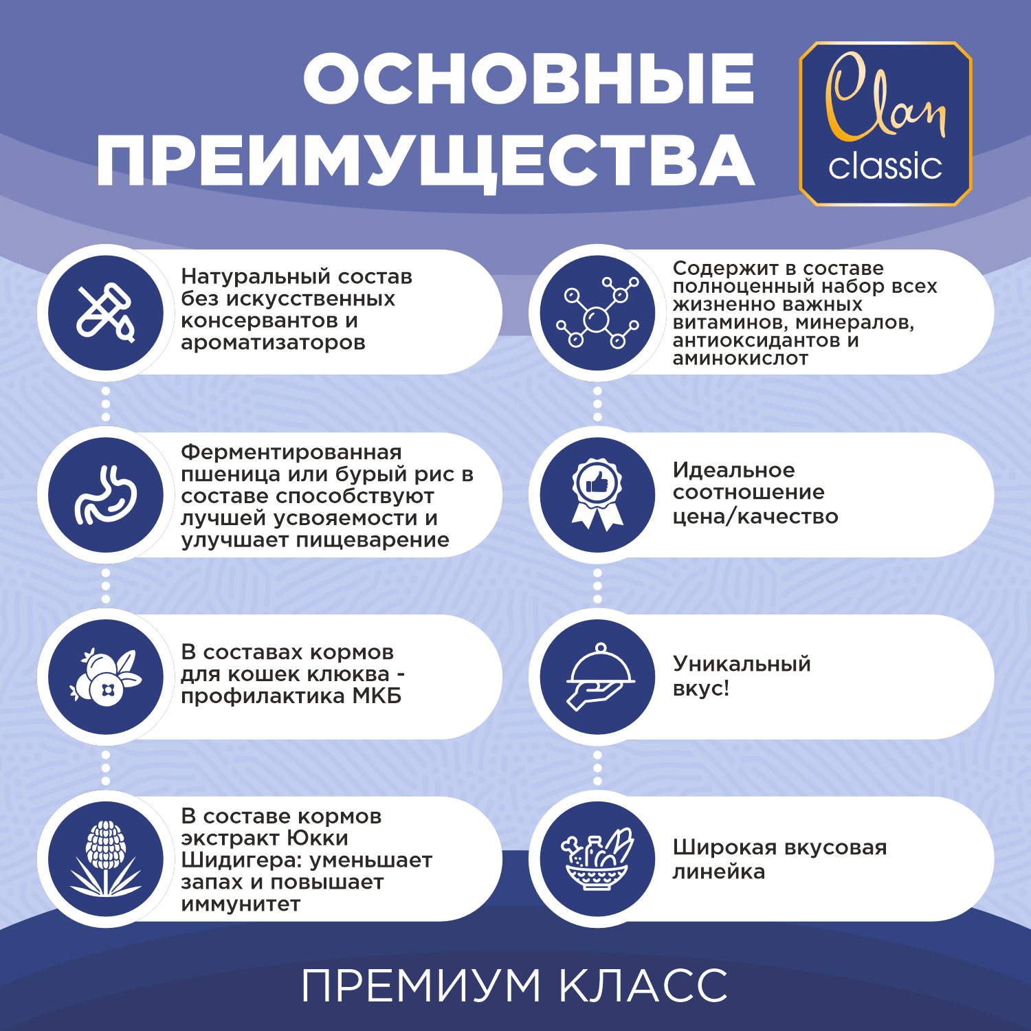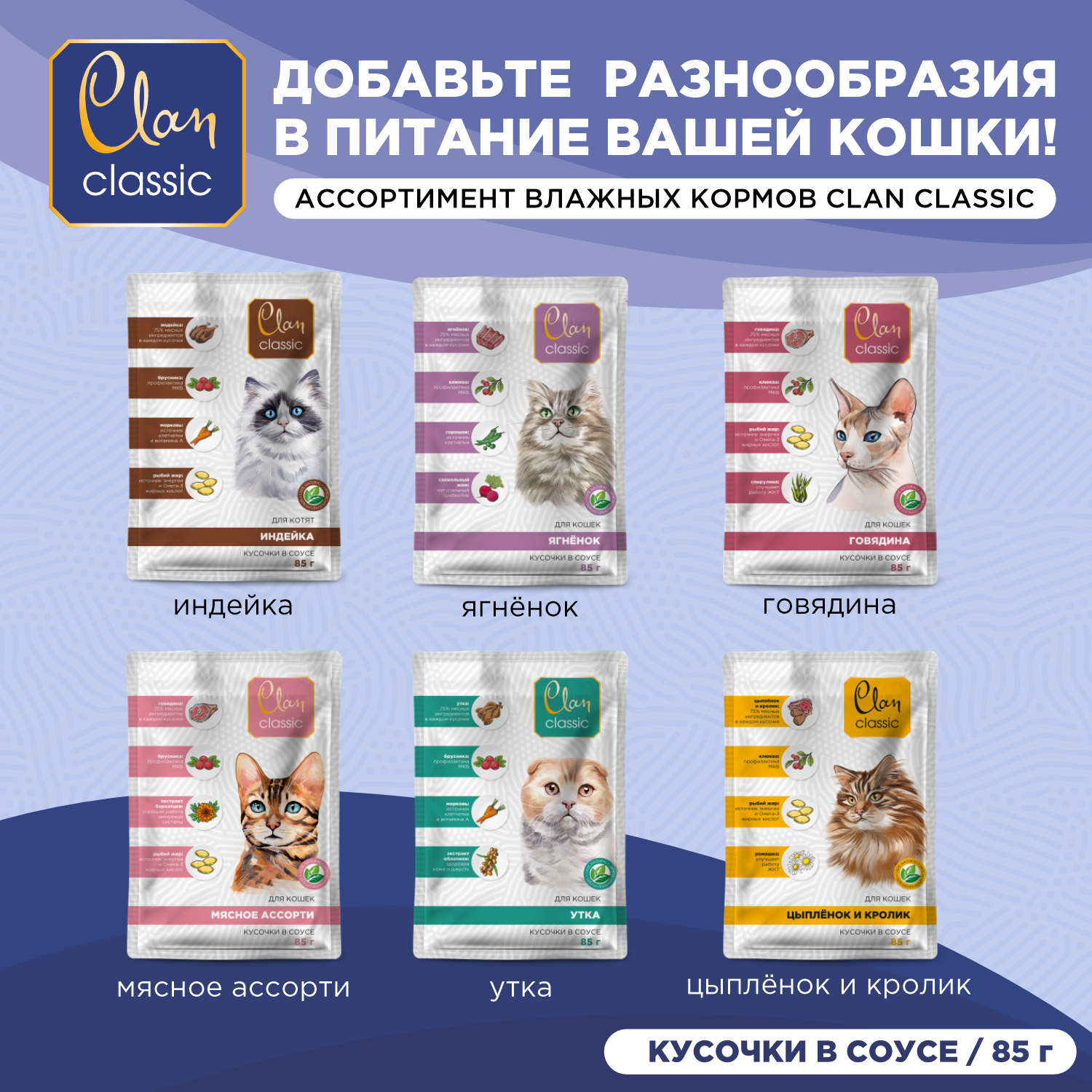 Влажный корм Clan CLASSIC для кошек, мясное ассорти, ягненок, клюква, горох, кусочки в соусе, 14шт*85г