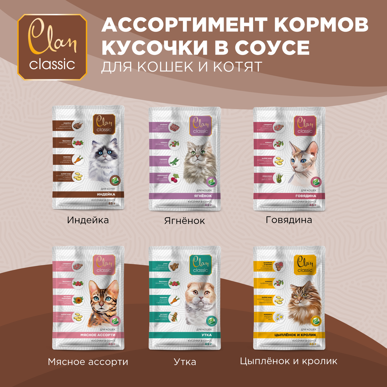 Влажный корм Clan CLASSIC для кошек, мясное ассорти, ягненок, клюква, горох, кусочки в соусе, 14шт*85г