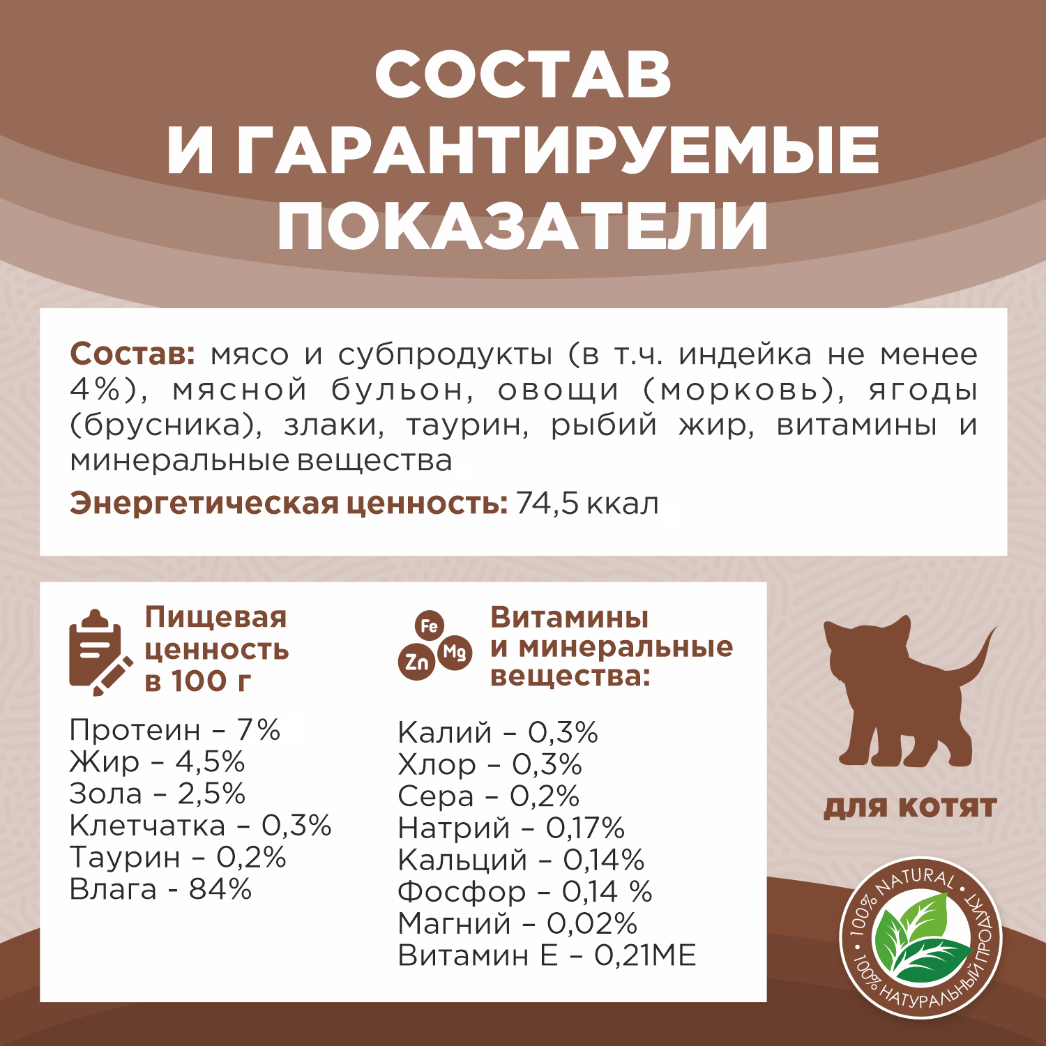 | Дозировка | Вес животного 2-4кг -суточная норма 25-55г Вес животного 4-6кг -суточная норма 55-85г Вес животного 6-8кг -суточная норма 55-115г Переход с предыдущего рациона следует осуществлять постепенно небольшими порциями в течение 5-7 дней |