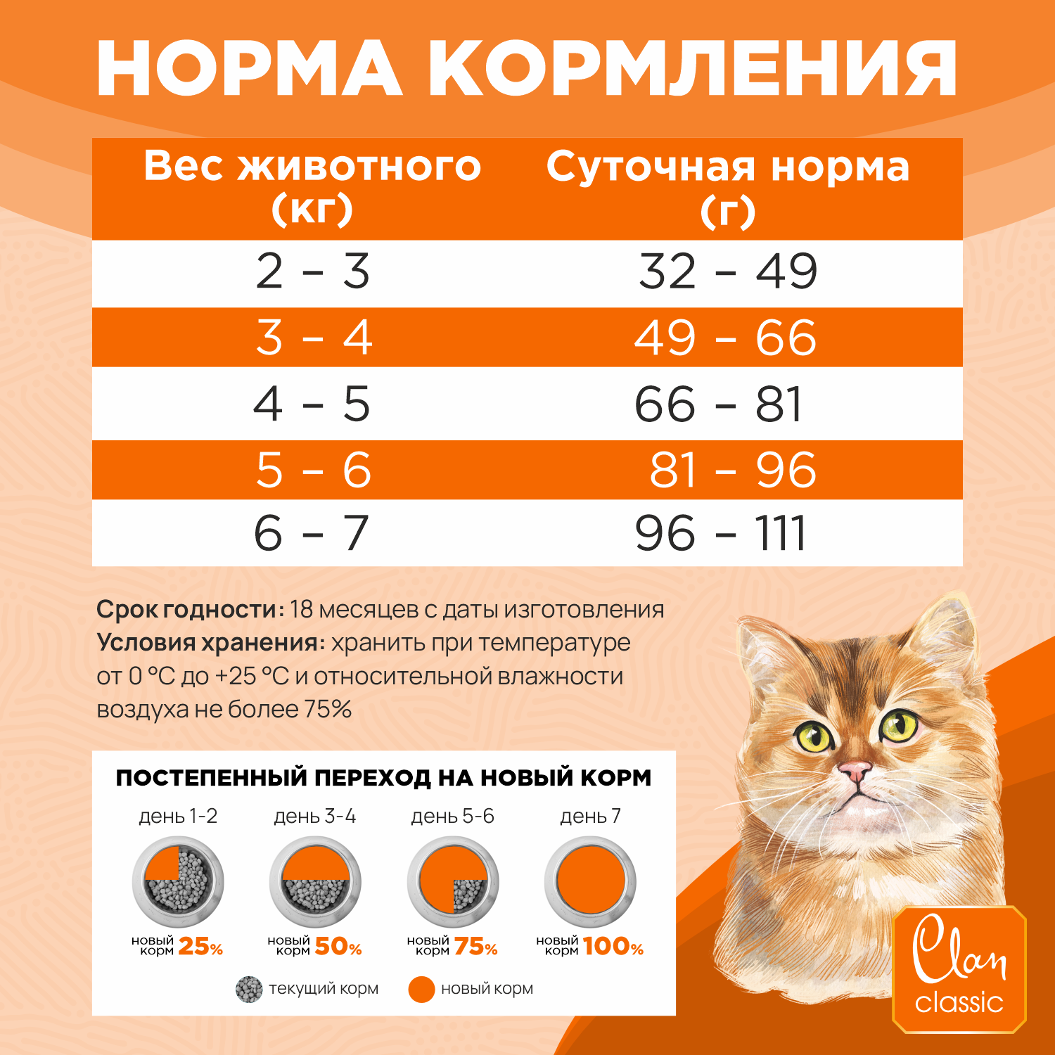| Дозировка | Вес животного 2-4кг -суточная норма 25-55г Вес животного 4-6кг -суточная норма 55-85г Вес животного 6-8кг -суточная норма 55-115г Переход с предыдущего рациона следует осуществлять постепенно небольшими порциями в течение 5-7 дней |