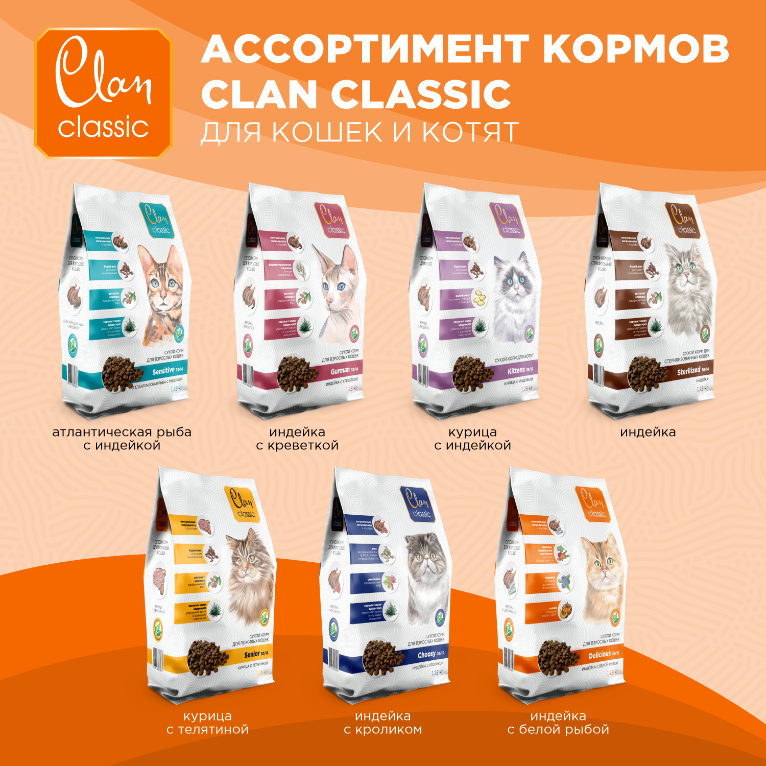 CLAN CLASSIC Delicious 32/15 корм сухой для кошек Индейка и Белая рыба 1.25кг