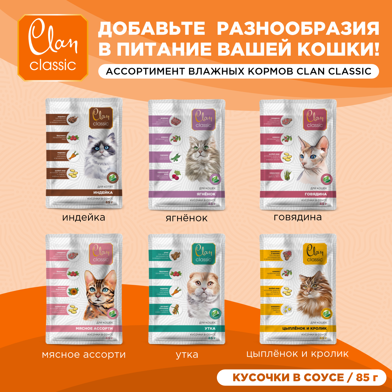 Влажный корм Clan CLASSIC для кошек, мясное ассорти, ягненок, клюква, горох, кусочки в соусе, 14шт*85г