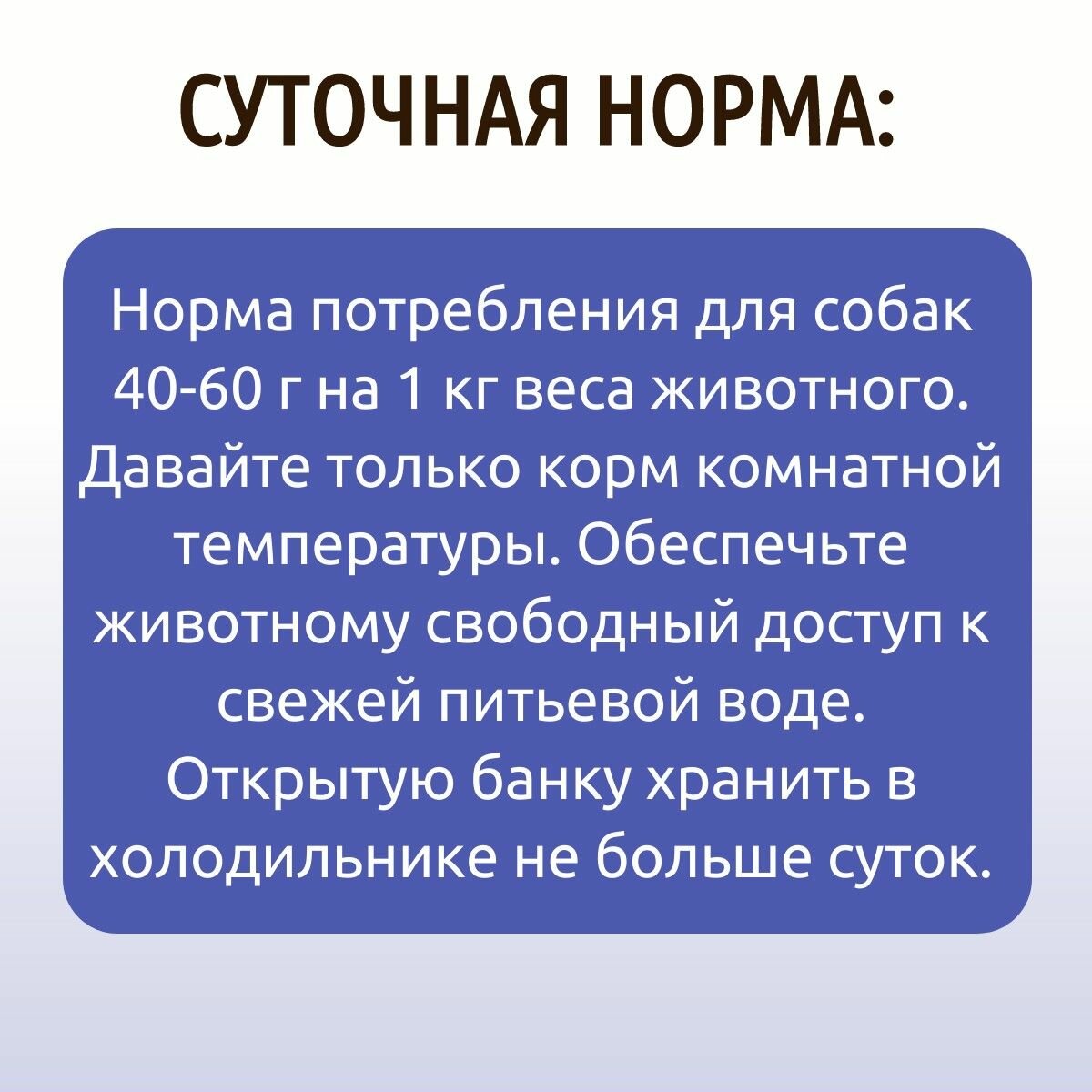 | Состав | говядина, субпродукты, натуральная желирующая добавка, злаки (но не более 2%), соль, вода |