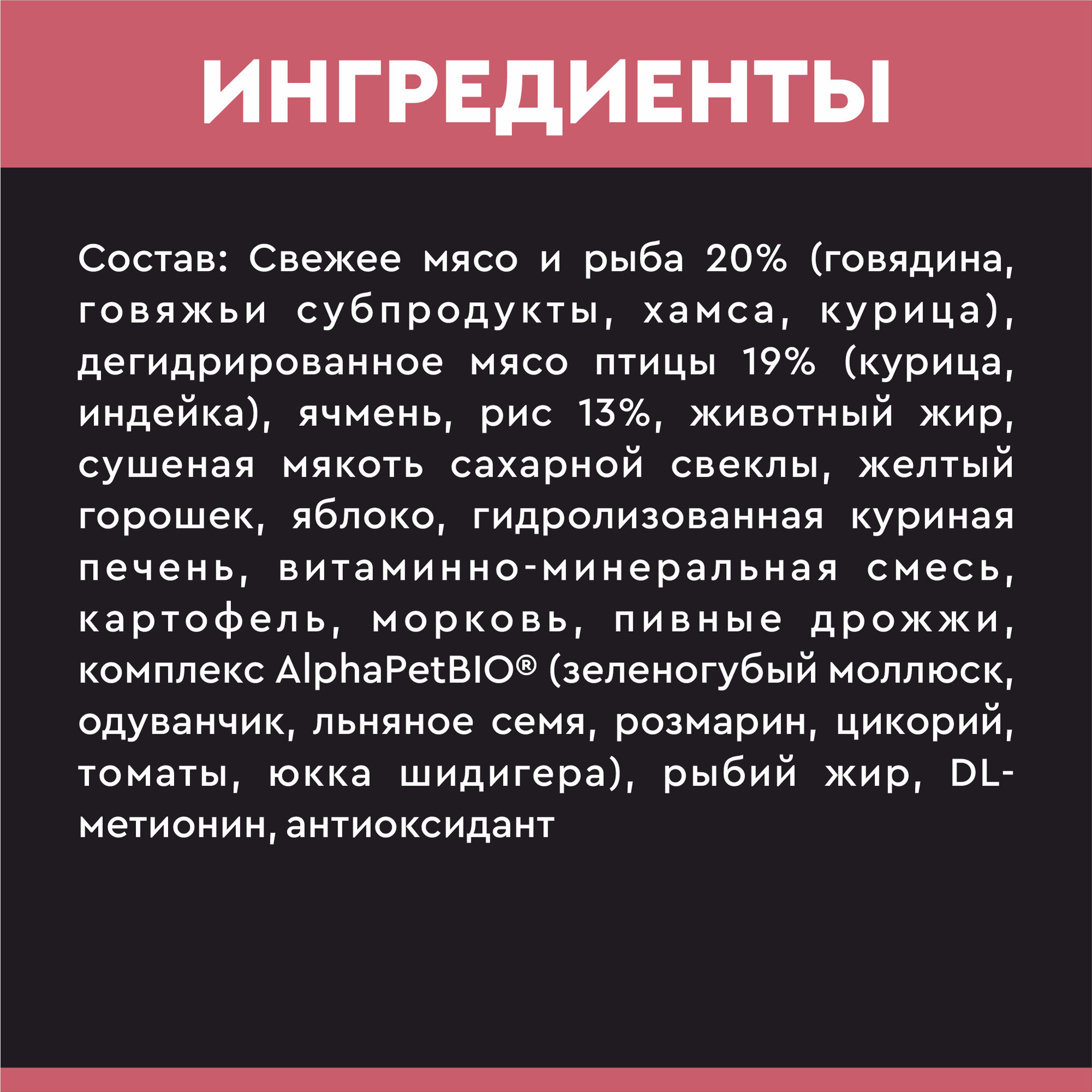 | Состав | свежее мясо и рыба 30% (ягненок, хамса, говяжий рубец, курица), дегидрированное мясо птицы 20,5% (курица, индейка), рис 10%, животный жир, ячмень, чечевица, яблоко, гидролизованная куриная печень, картофель, желтый горошек, витаминно-минеральная смесь сушеная мякоть сахарной свеклы, морковь, пивные дрожжи, комплекс alphapetbio® (зеленогубый моллюск, одуванчик, льняное семя, розмарин, цикорий, томаты, юкка шидигера), рыбий жир, dl-метионин, антиоксидант |