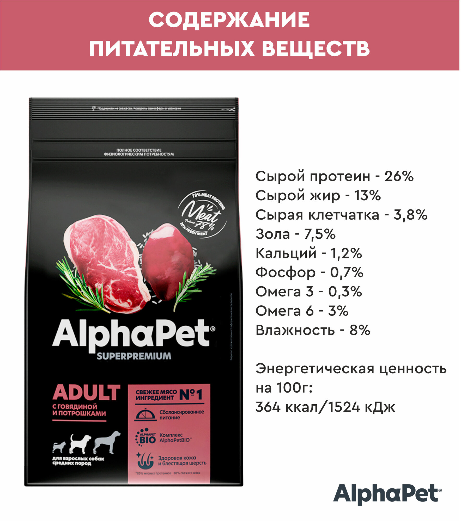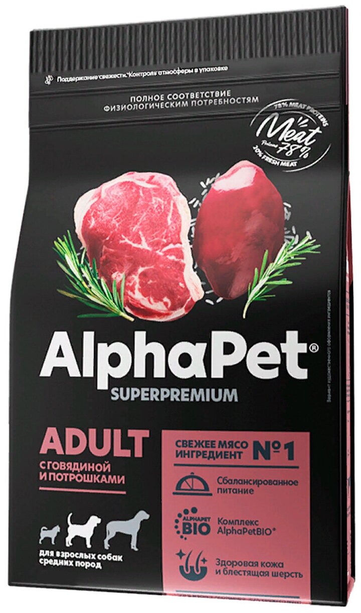 Купить AlphaPet Superpremium - Сухой корм для взрослых собак средних пород, с Говядиной и Потрошками (2 кг)