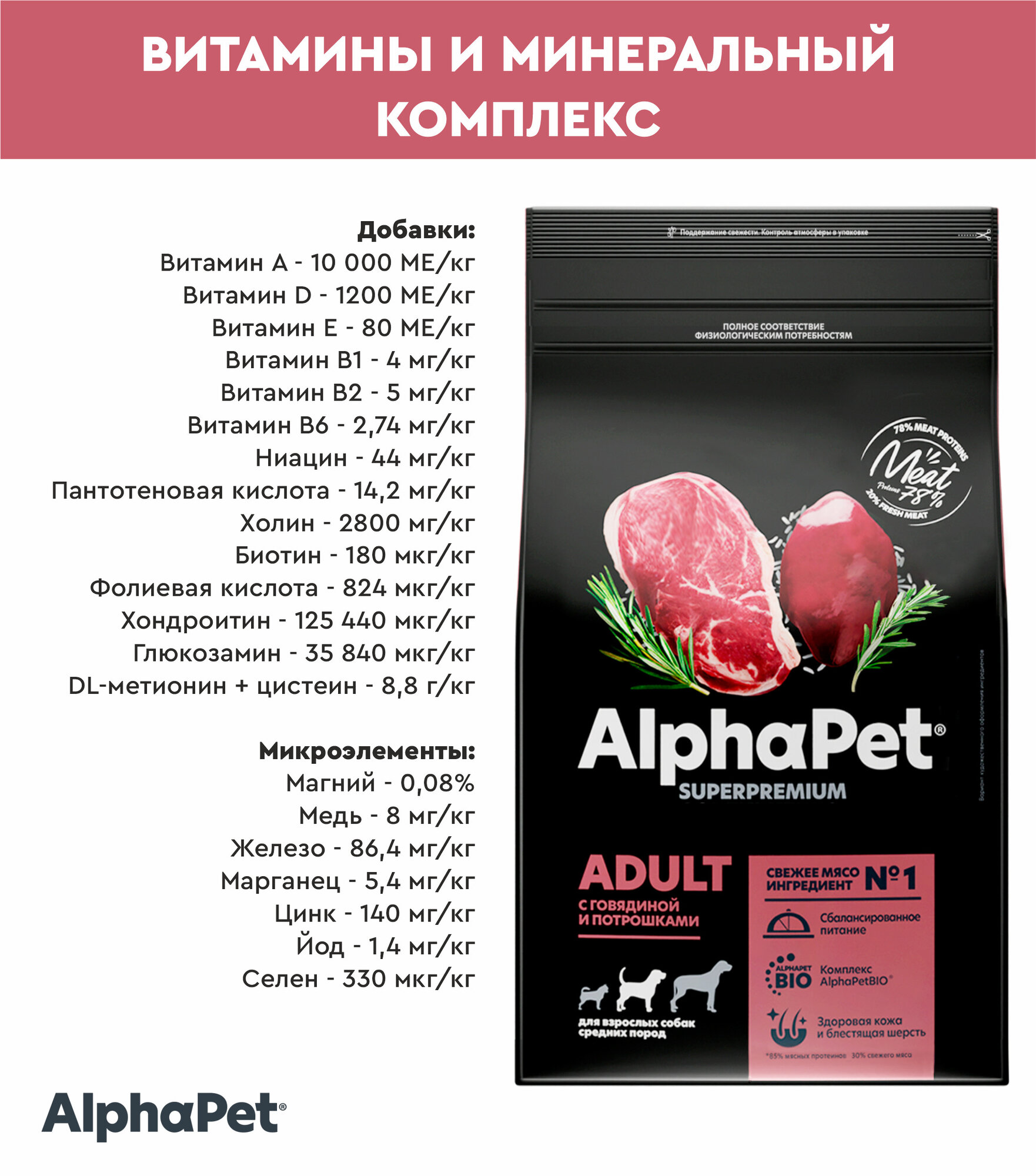 ALPHAPET SUPERPREMIUM ADULT для взрослых собак средних пород с говядиной и потрошками (12 + 12 кг)