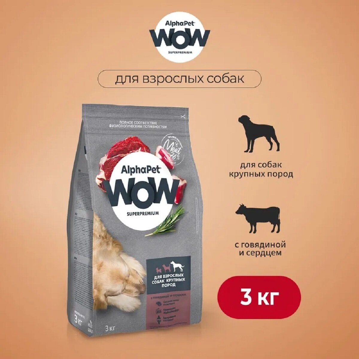 Купить ALPHAPET WOW корм сухой для взрослых собак крупных пород с Говядиной и сердцем 3кг