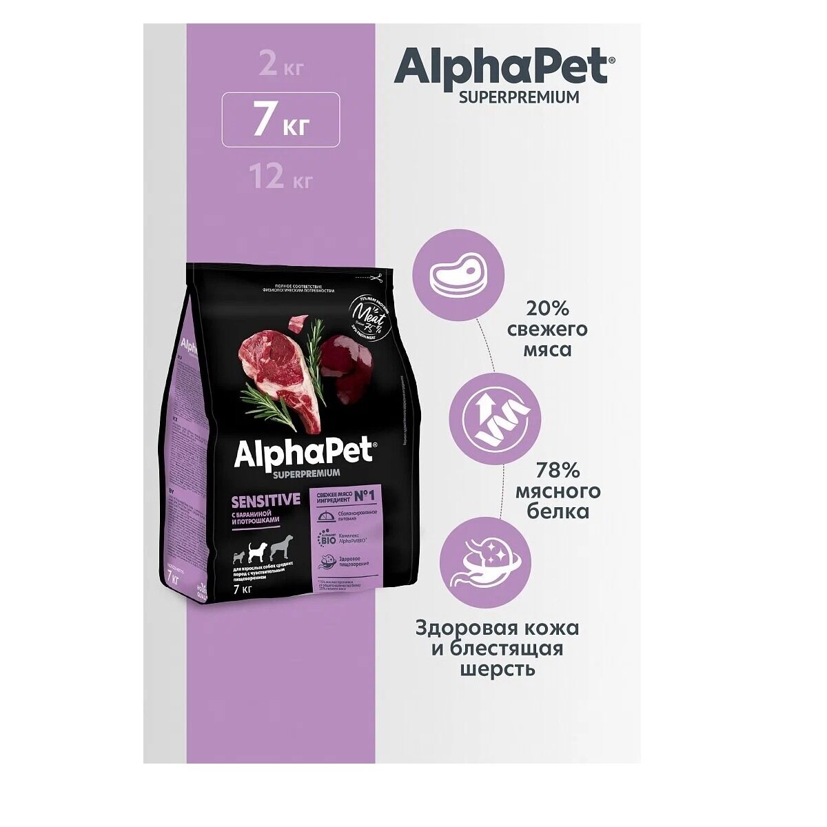 Сухой корм для собак средних пород AlphaPet Superpremium с чувствительным пищеварением полнорационный, с бараниной и потрошками, 7 кг