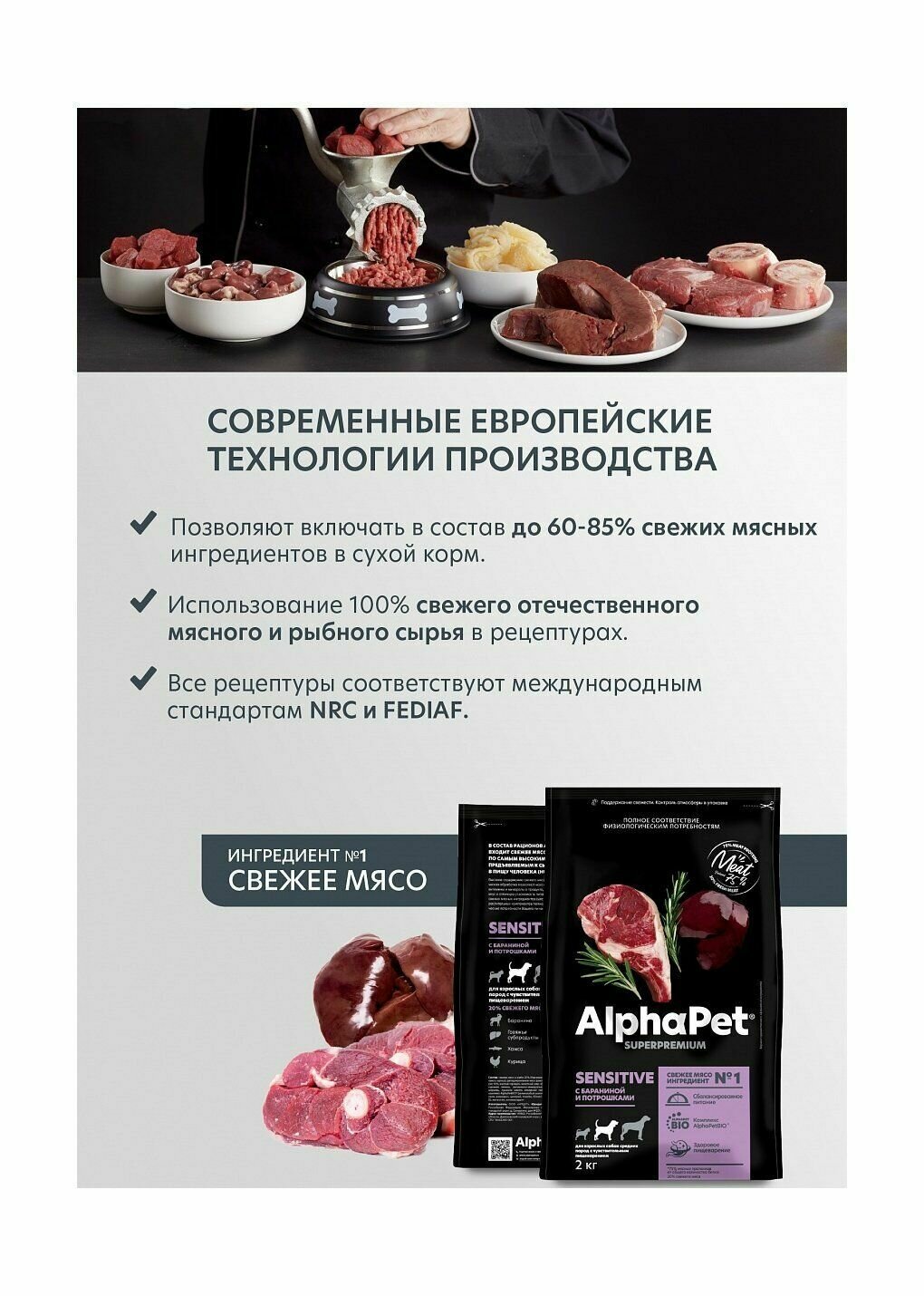 ALPHAPET SUPERPREMIUM корм для собак средних пород с чувствительным пищеварением с бараниной и потрошками 2кг