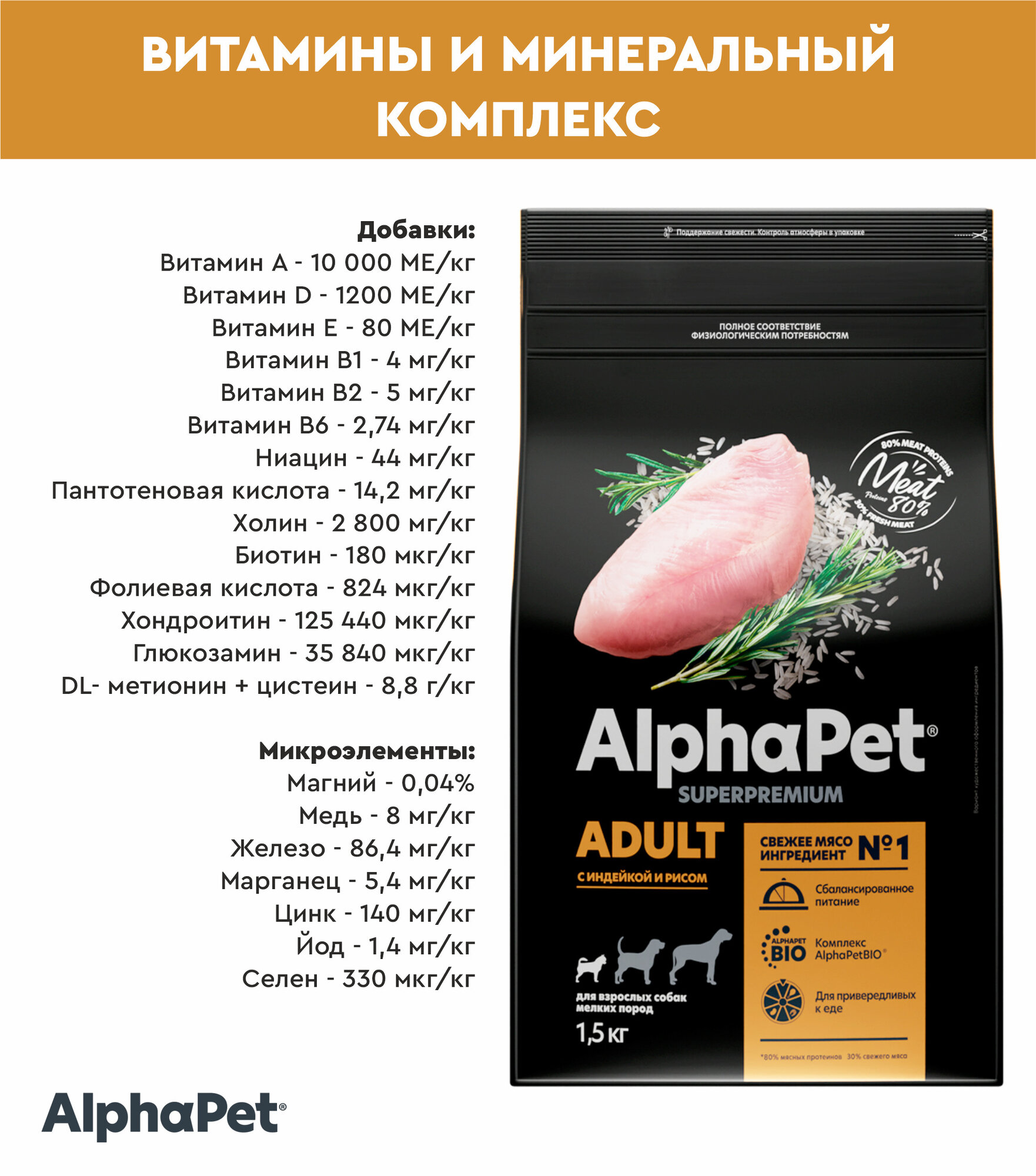 Сухой полнорационный корм AlphaPet Superpremium для собак мелких пород, с индейкой и рисом, 1.5 кг