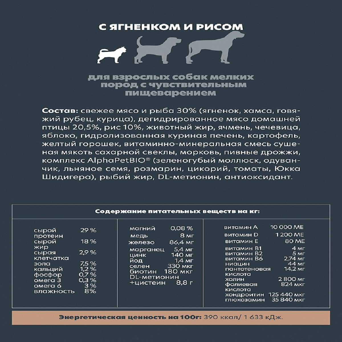 AlphaPet Сухой полнорационный корм Superpremium с ягненком и рисом, для взрослых собак мелких пород с чувствительным пищеварением, 1,5 кг