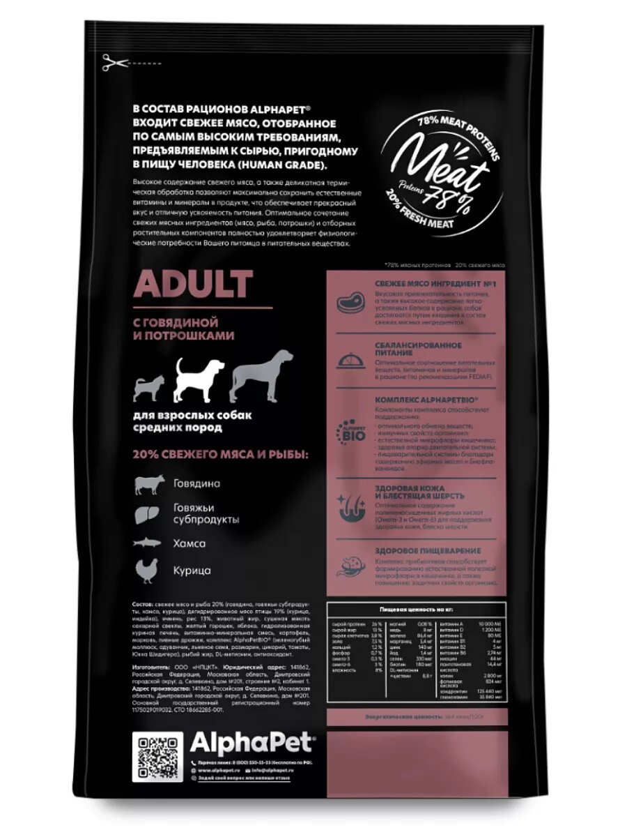 ALPHAPET SUPERPREMIUM ADULT для взрослых собак средних пород с говядиной и потрошками (12 + 12 кг)