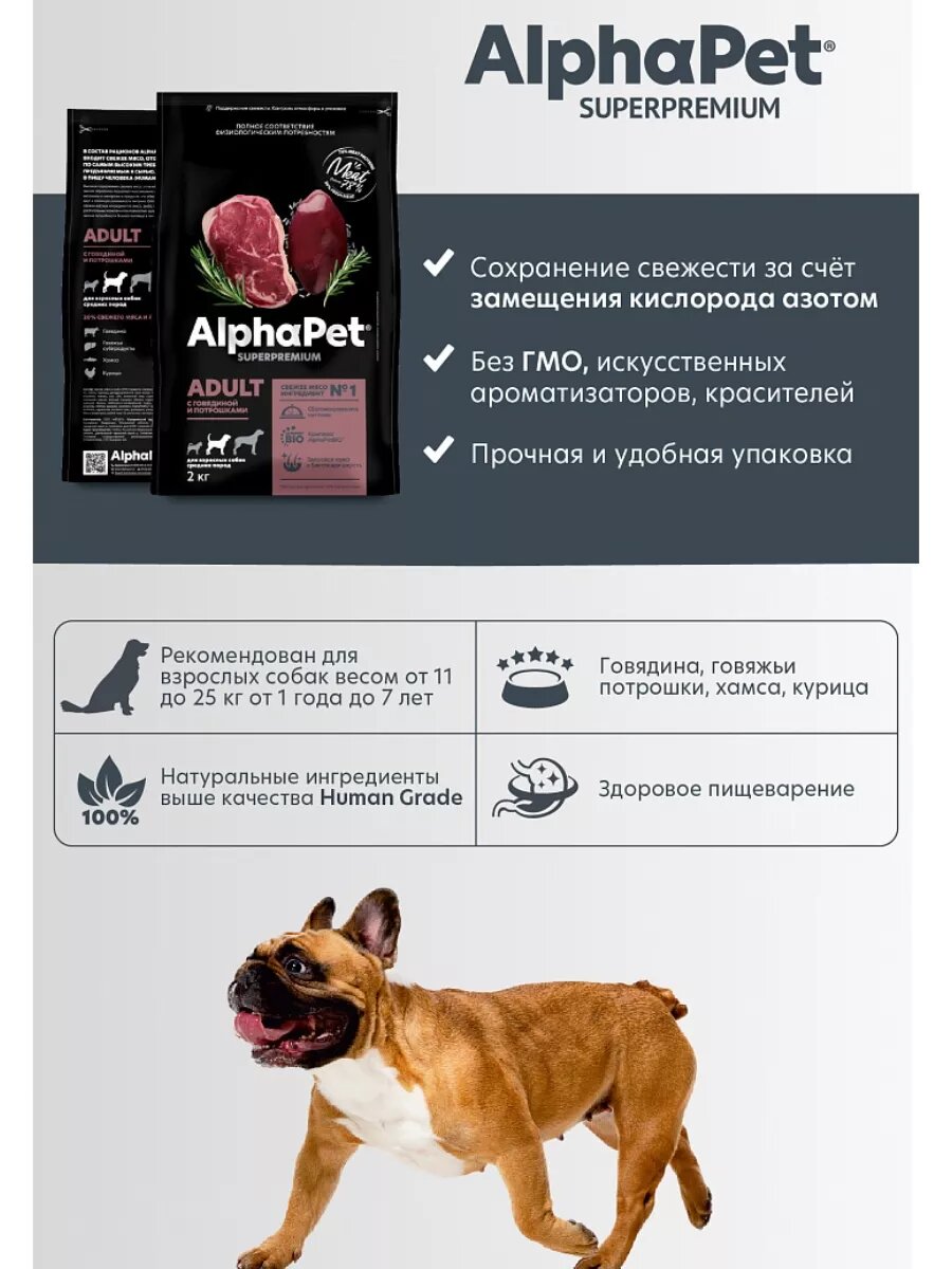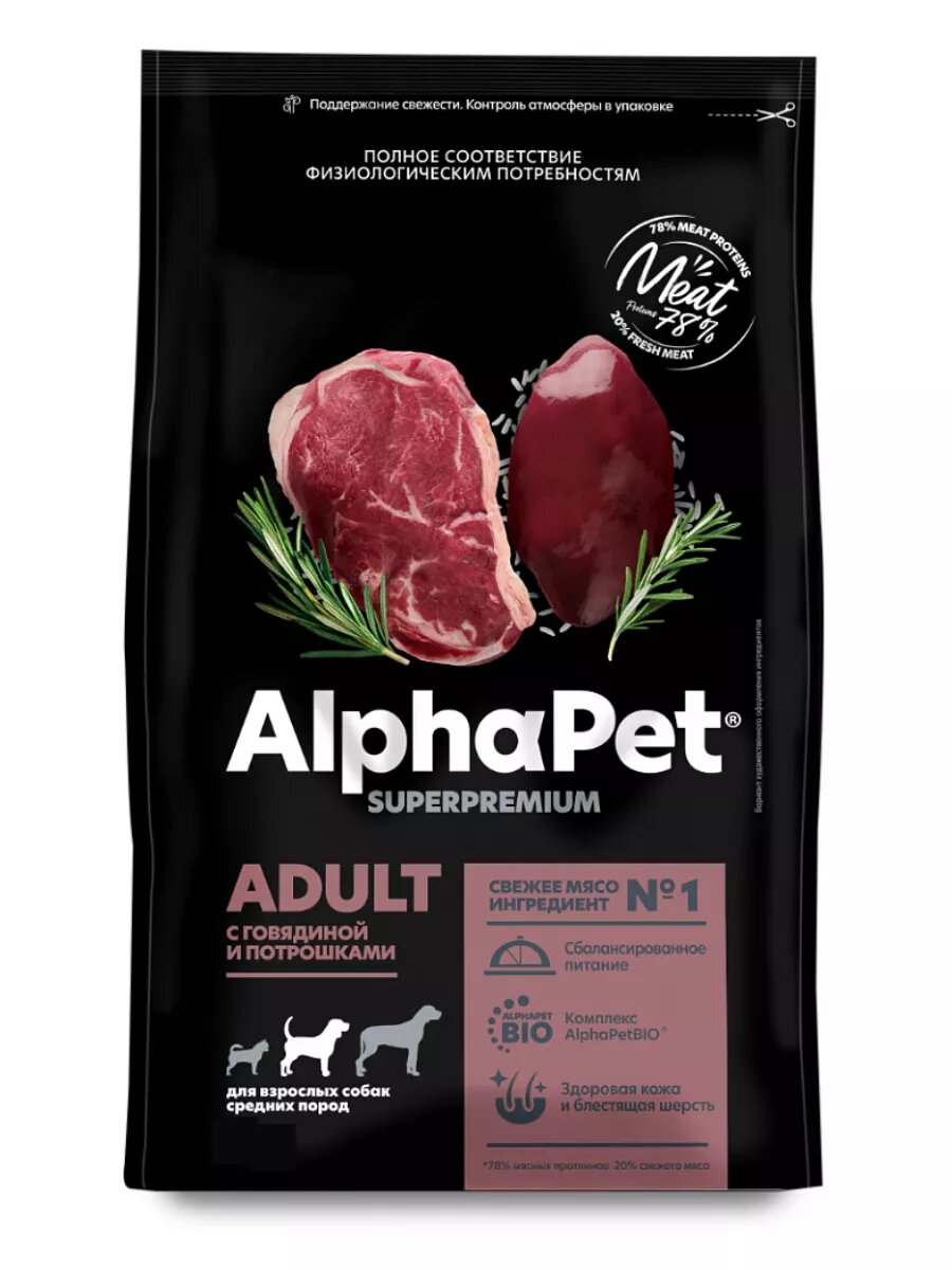 Сухой корм AlphaPet для взрослых собак средних пород с говядиной и потрохами 2 кг
