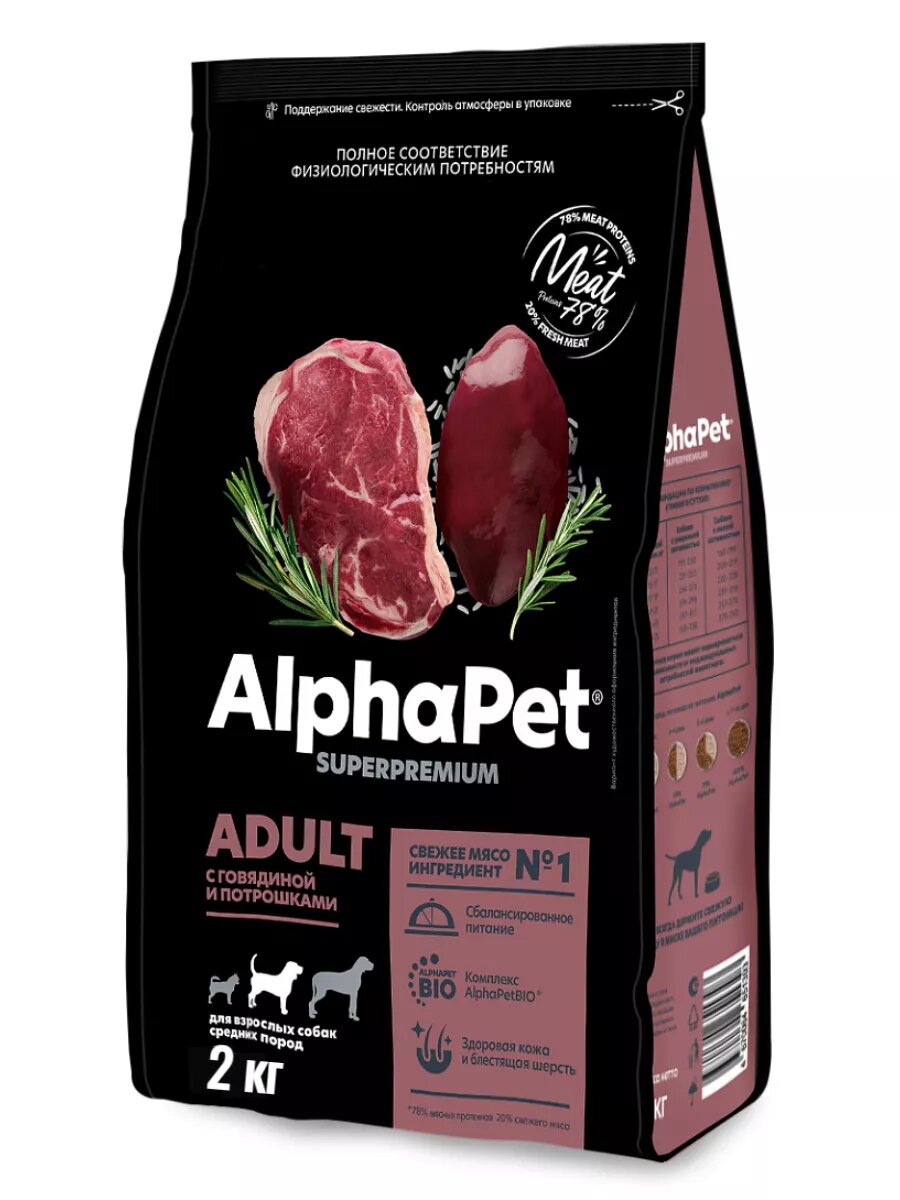 Купить ALPHAPET Сухой корм для средних собак говядина и потрошки 2 кг