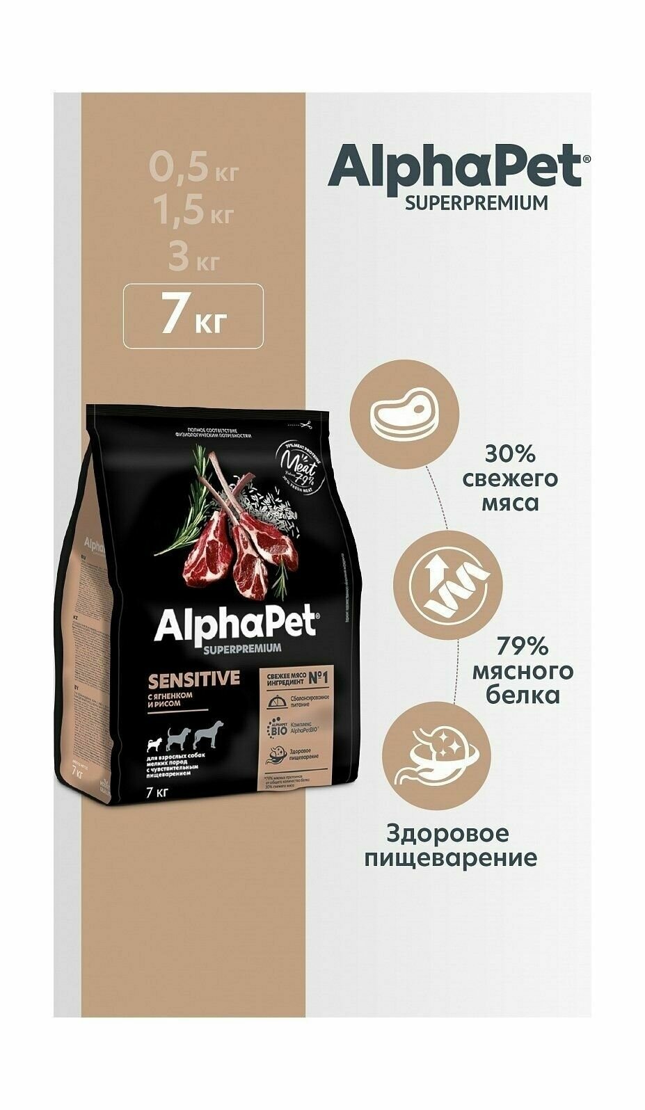 ALPHAPET SUPERPREMIUM 1,5 кг сухой корм для взрослых собак мелких пород с чувствительным пищеварением с ягненком и рисом, ALPHAPET