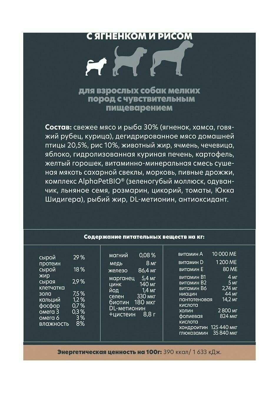 Сухой корм Alpha Pet АльфаПет с ягненком и рисом для взрослых собак мелких пород с чувствительным пищеварением, 1,5 кг