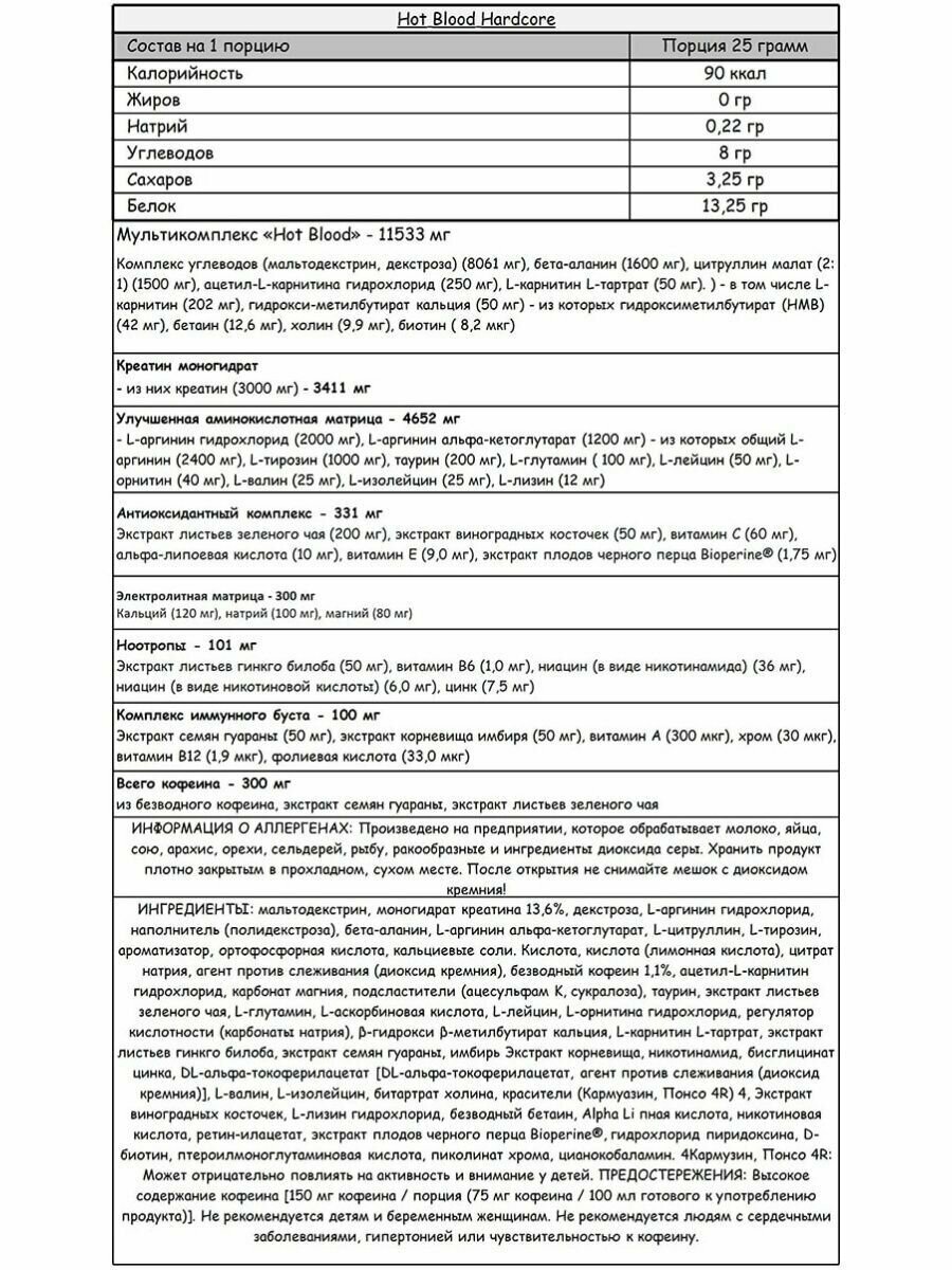 | Основные ингредиенты | аргинин / бета-аланин / кофеин / креатин / таурин |