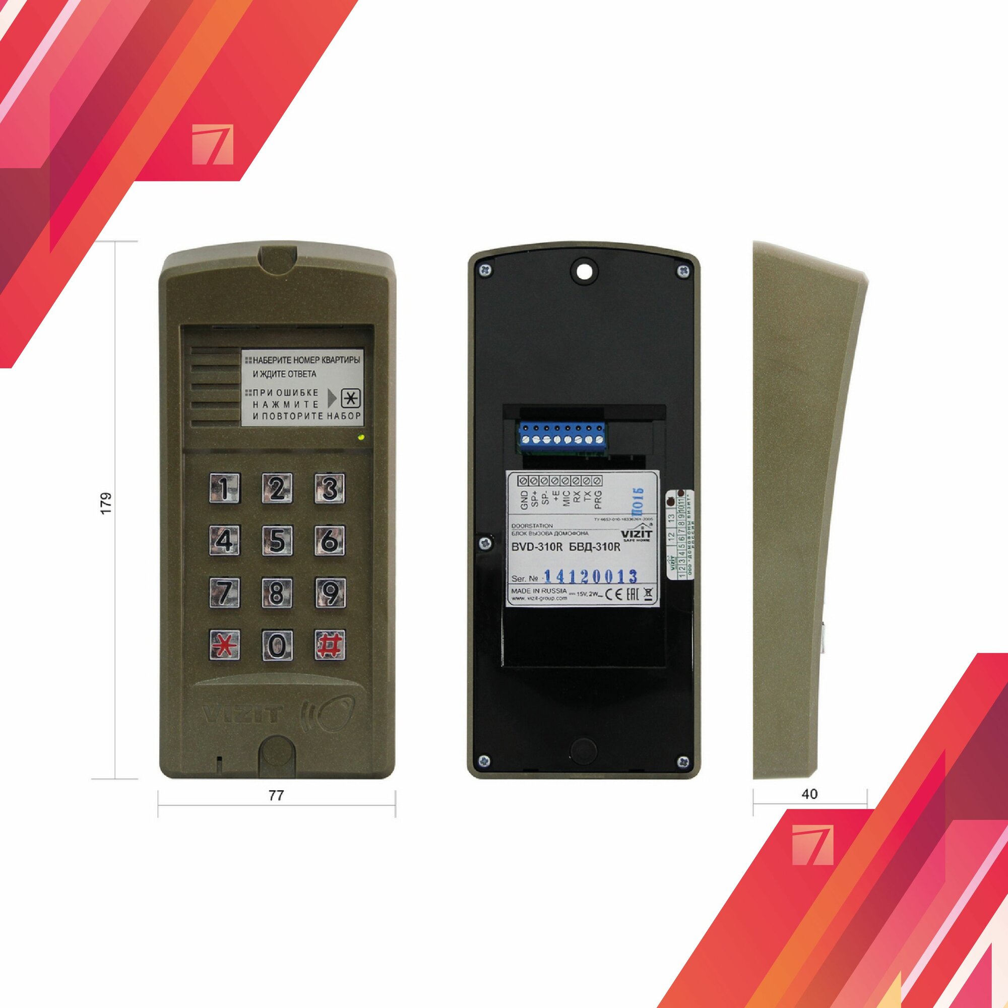 | Дополнительная информация | дуплексная громкоговорящая связь с абонентом, высокая климатическая устойчивость, возможность выключения вызова отдельных квартир; подсветка наборной клавиатуры и зоны считывателя RFID |