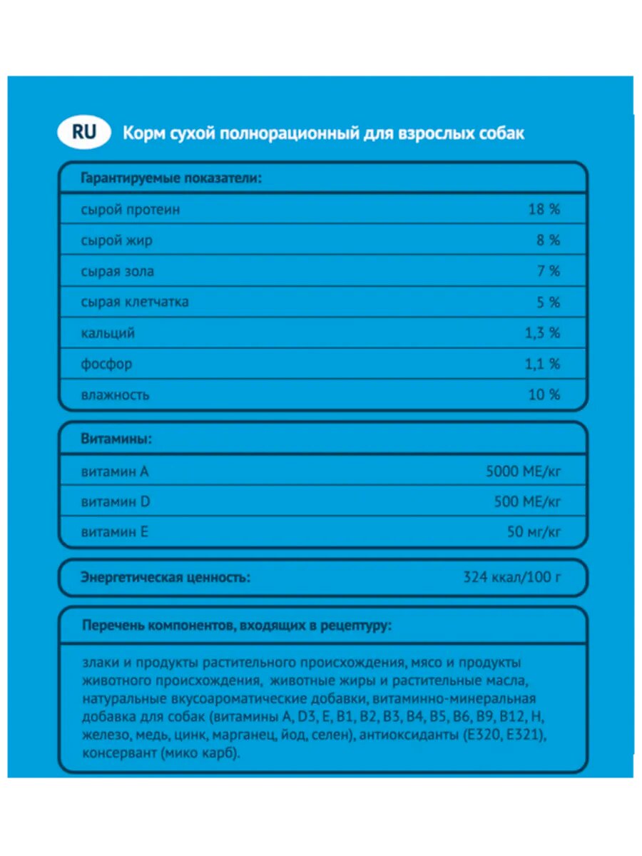 | Состав | злаки и продукты растительного происхождения, мясо и продукты животного происхождения, животные жиры и растительные масла, натуральные вкусоароматические добавки, витаминно-минеральная добавка для собак (витамины А, D3, Е, В1, В2, В3, В4, В5, В6, В9, В12, Н, железо, медь, цинк, марганец, йод, селен),антиоксиданты (Е320, Е321), консервант (мико карб). |