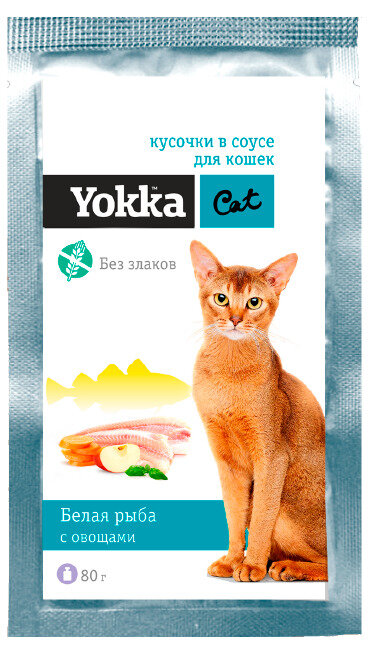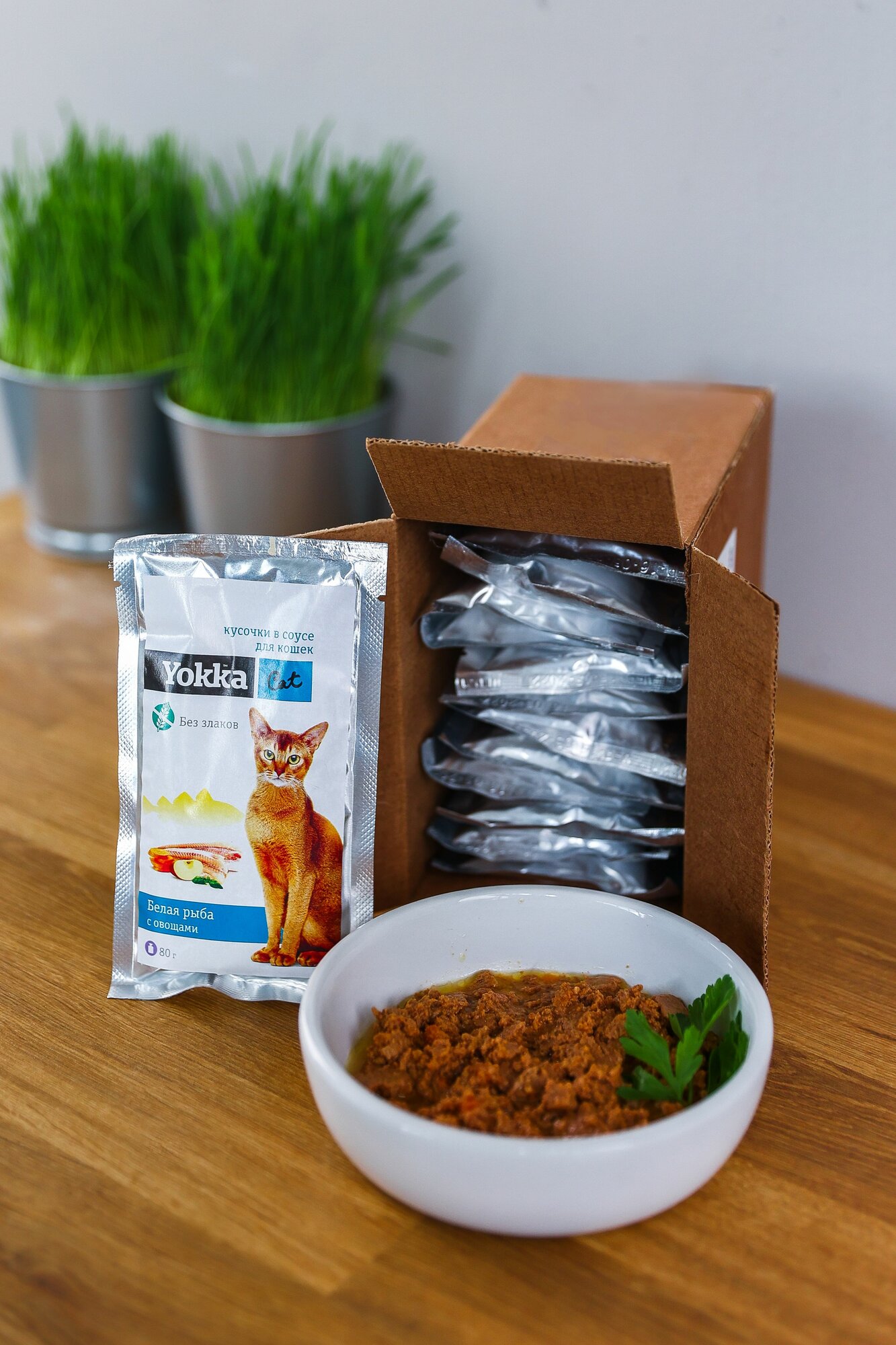 Yokka Cat Натуральный беззерновой консервированный корм для кошек из рыбы с овощами, кусочки в соусе, 80г (12 шт/уп) интересное:
