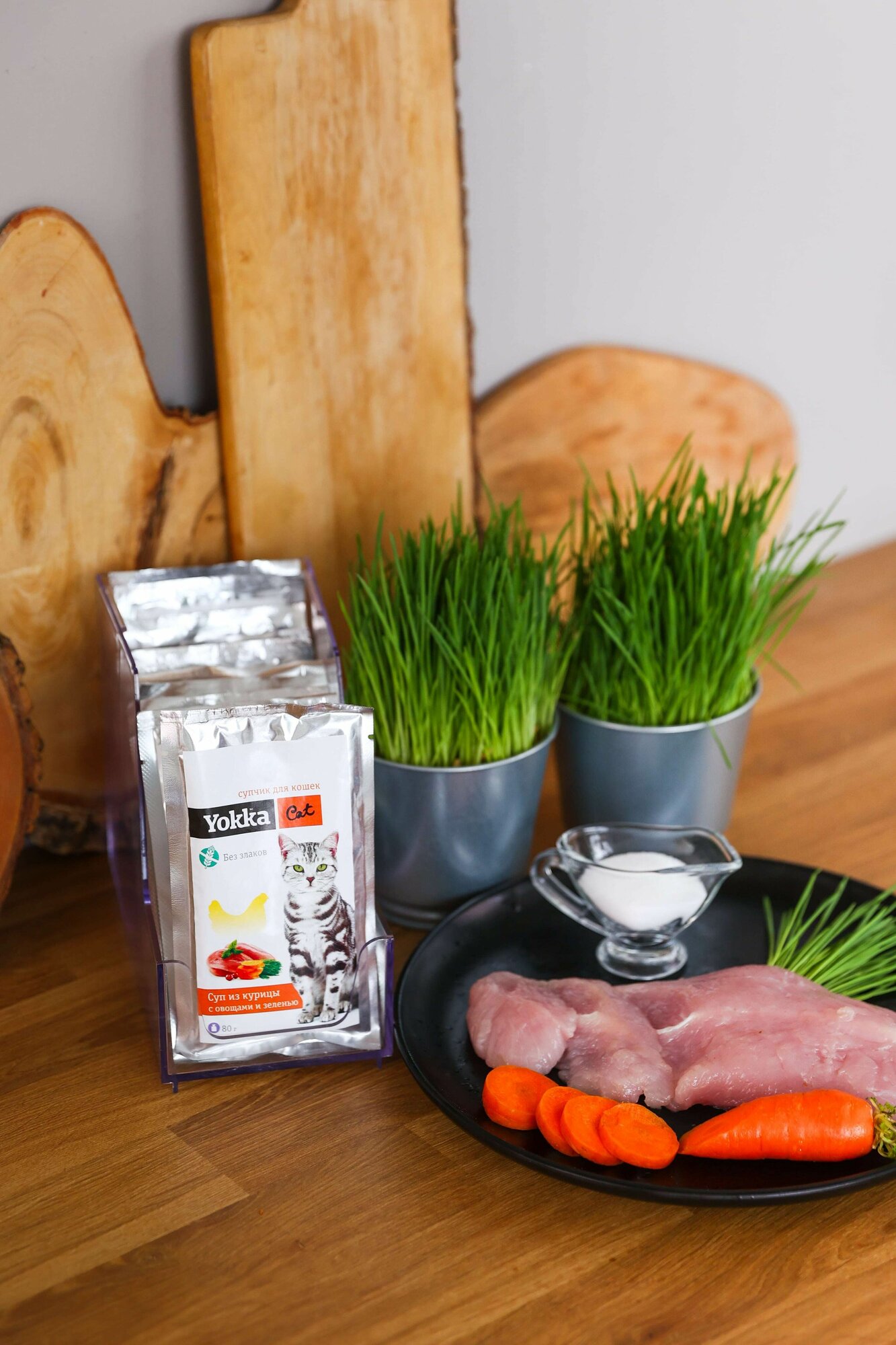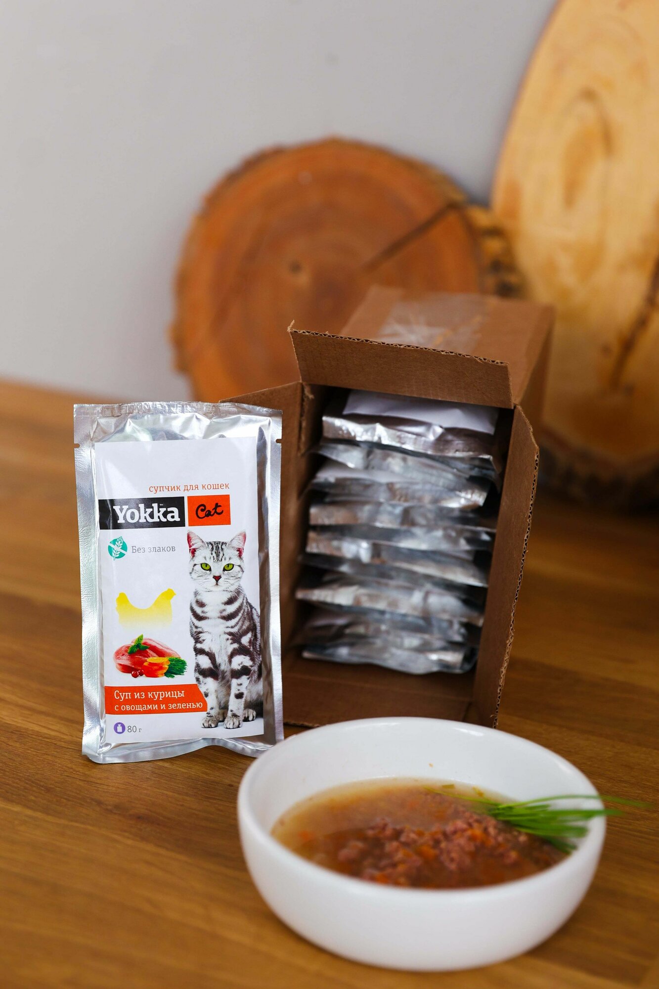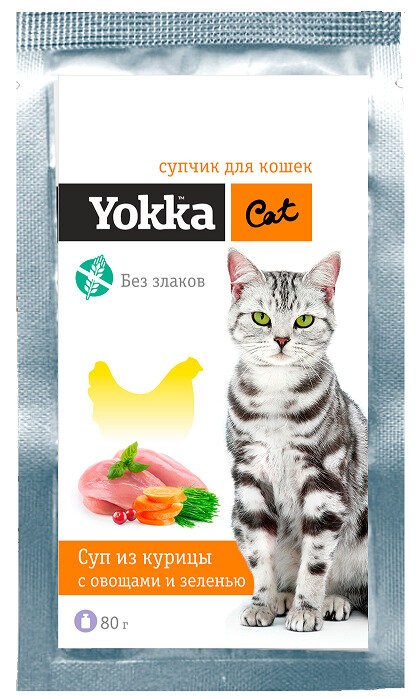 Yokka Cat Беззерновой натуральный консервированный корм (СУП) для кошек из курицы с овощами и пророщенным овсом, 80г (12 шт/уп) интересное: