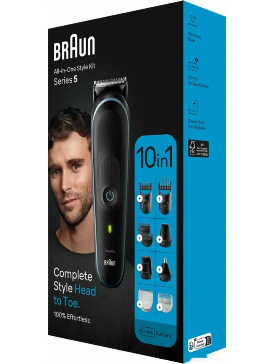 Набор 10 в 1 триммер аккумуляторный Braun MGK5445 для бороды и усов с 6 гребнями и 3 насадками, регулировкой от 0,5 до 21 мм, водонепроницаемый, лезвия из нержавеющей стали