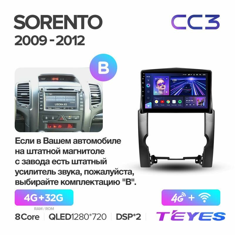 Купить Магнитола Kia Sorento 2 XM 2009-2012 (Комплектация В) Teyes CC3 4/32GB, штатная магнитола, 8-ми ядерный процессор, QLED экран, 2 DSP, 4G, Wi-Fi, 2 DIN