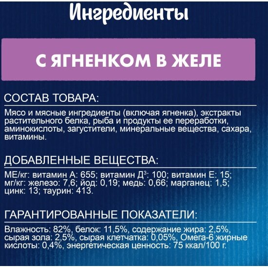 | Состав | мясо и и продукты его переработки (из которых кролик 4%), экстракты растительного белка, рыба и продукты ее переработки, минеральные вещества, аминокислоты, загустители, сахара, витамины |