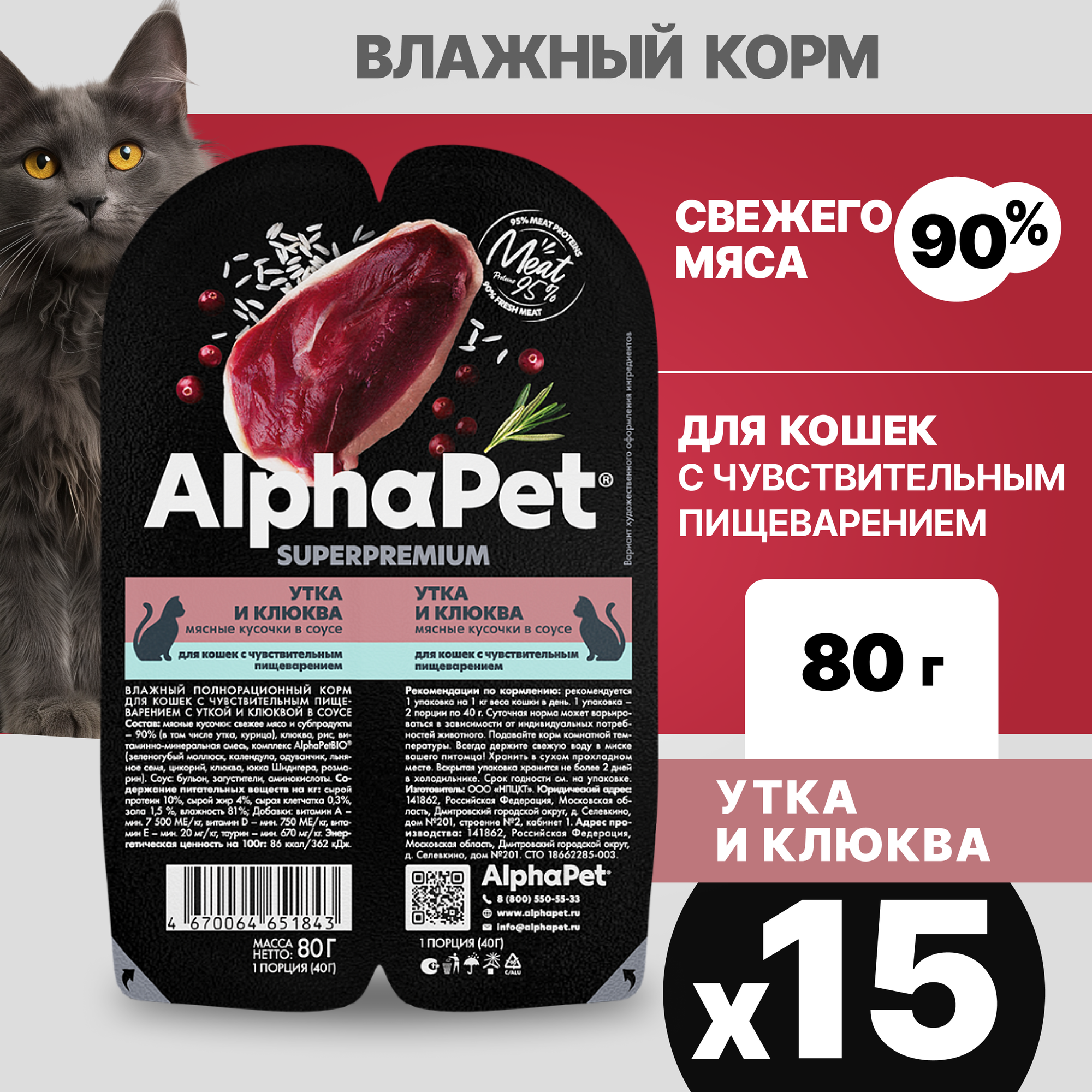 Купить Влажный корм Alphapet Superpremium Альфа Пет для взрослых кошек с чувствительным пищеварением Утка клюква в соусе (15 шт * 80 гр)