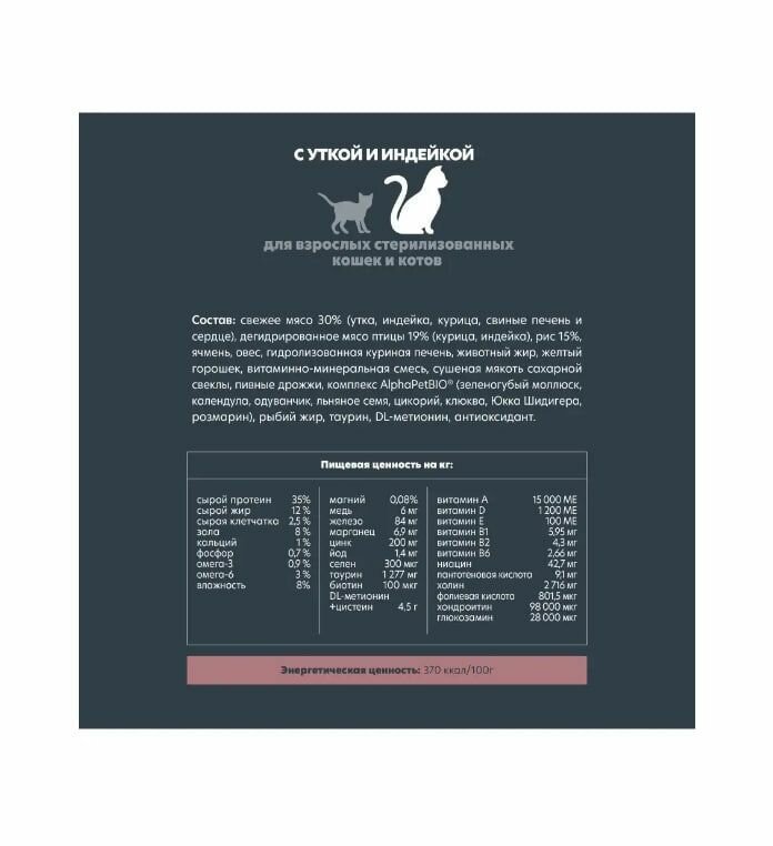 AlphaPet Superpremium - Сухой корм для взрослых стерилизованных котов и кошек, с Уткой и Индейкой (3 кг)