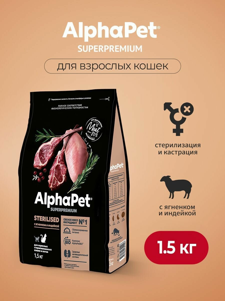 AlphaPet Superpremium сухой полнорационный корм для взрослых стерилизованных кошек и котов с ягненком и индейкой - 1,5 кг