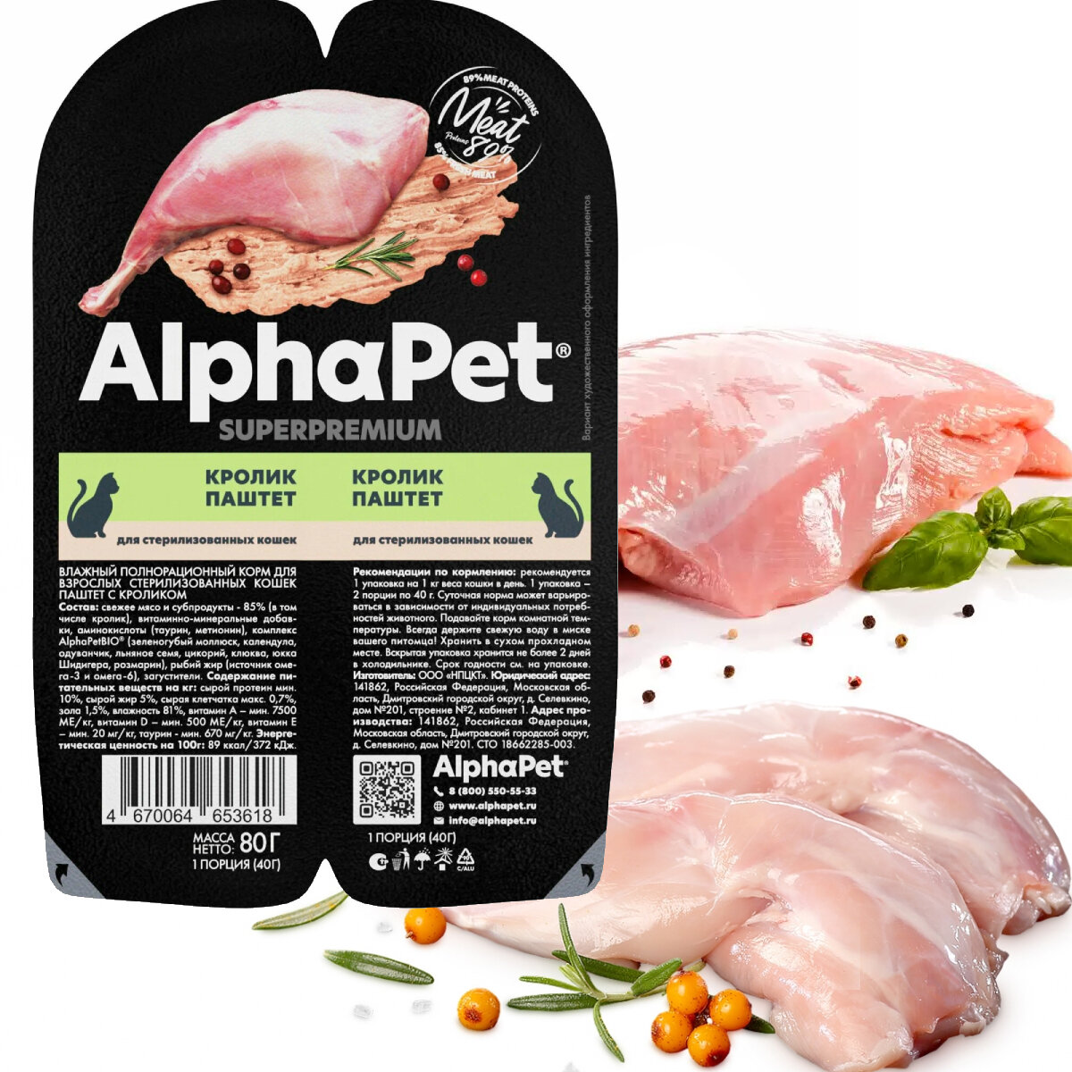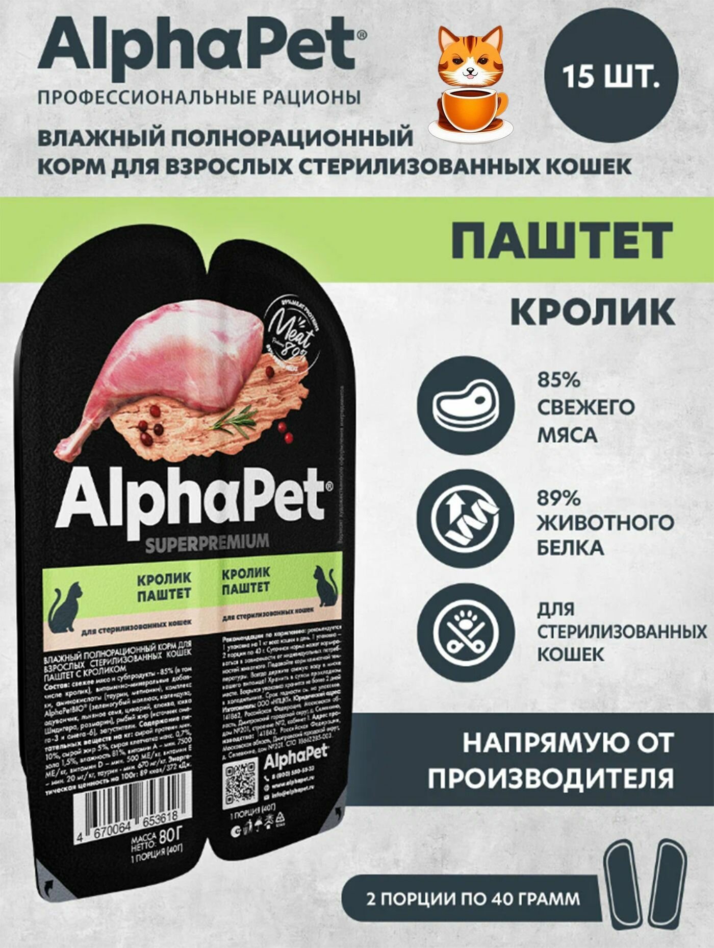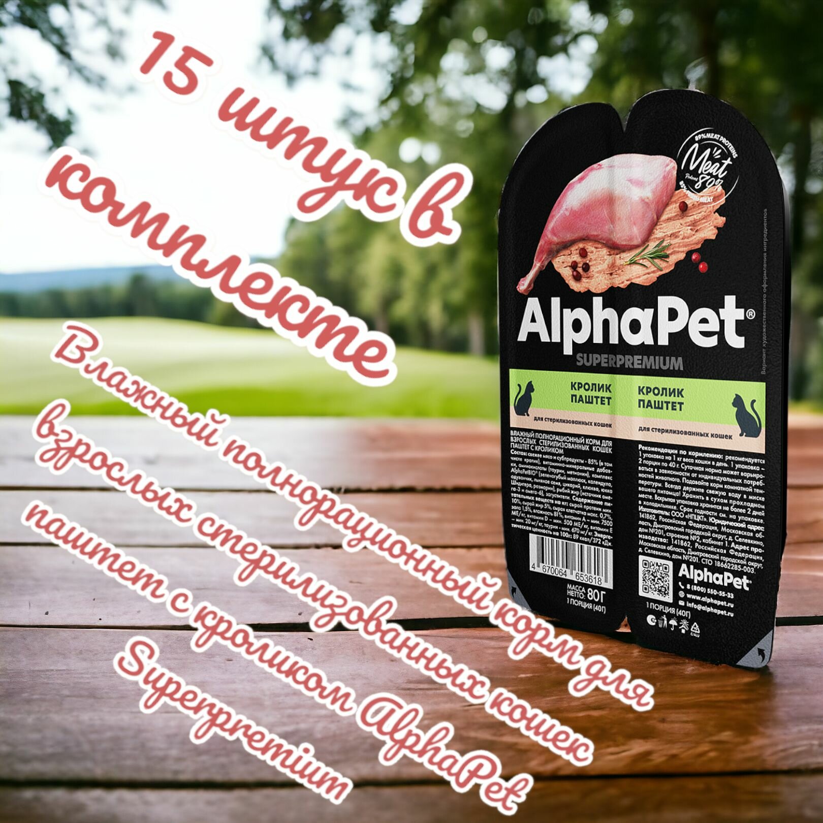 Влажный корм AlphaPet Superpremium для взрослых стерилизованных кошек паштет с кроликом, 15 шт по 80гр