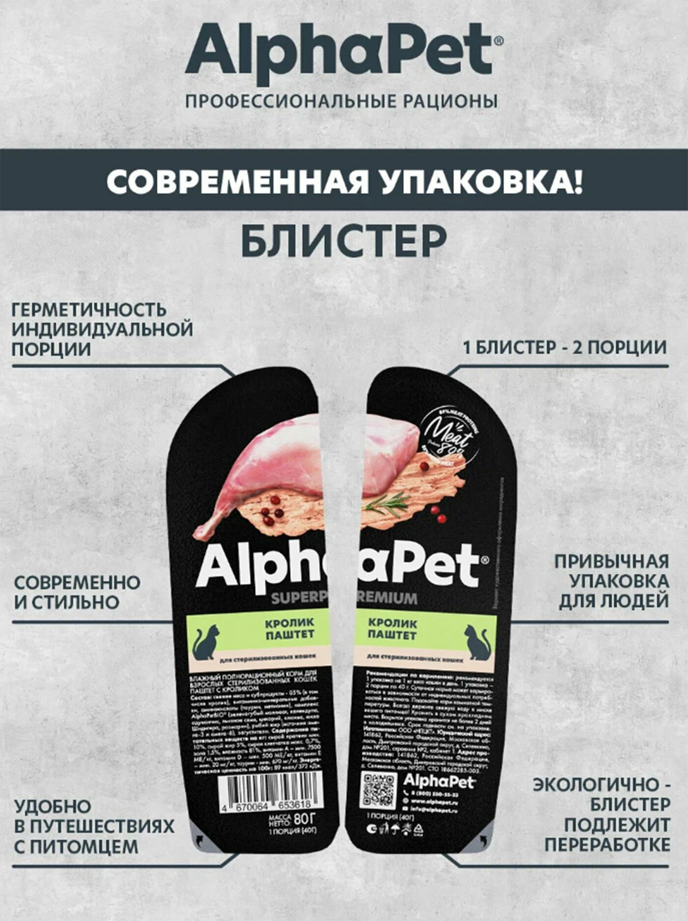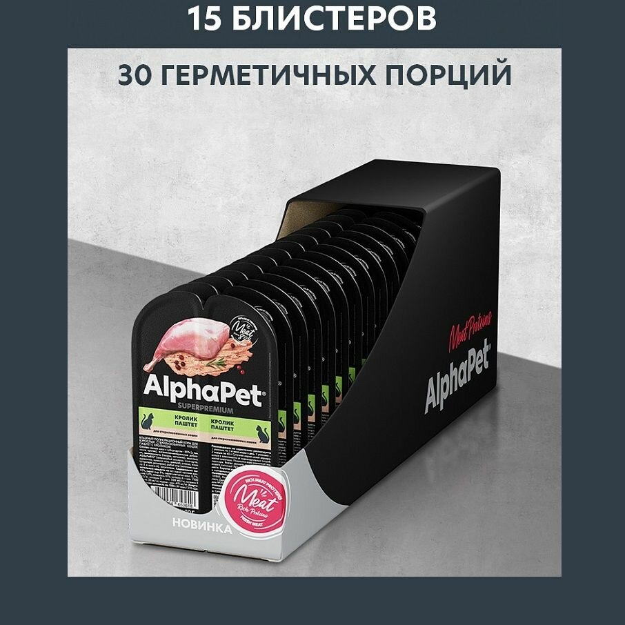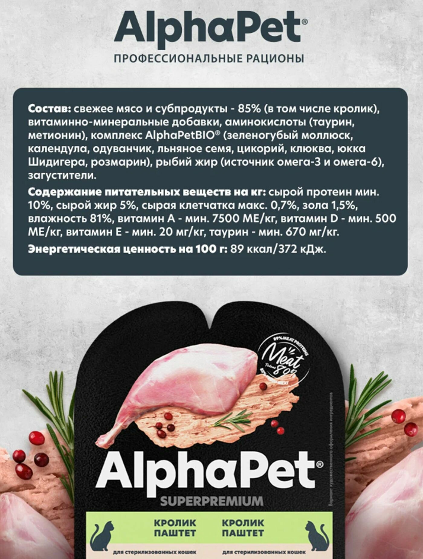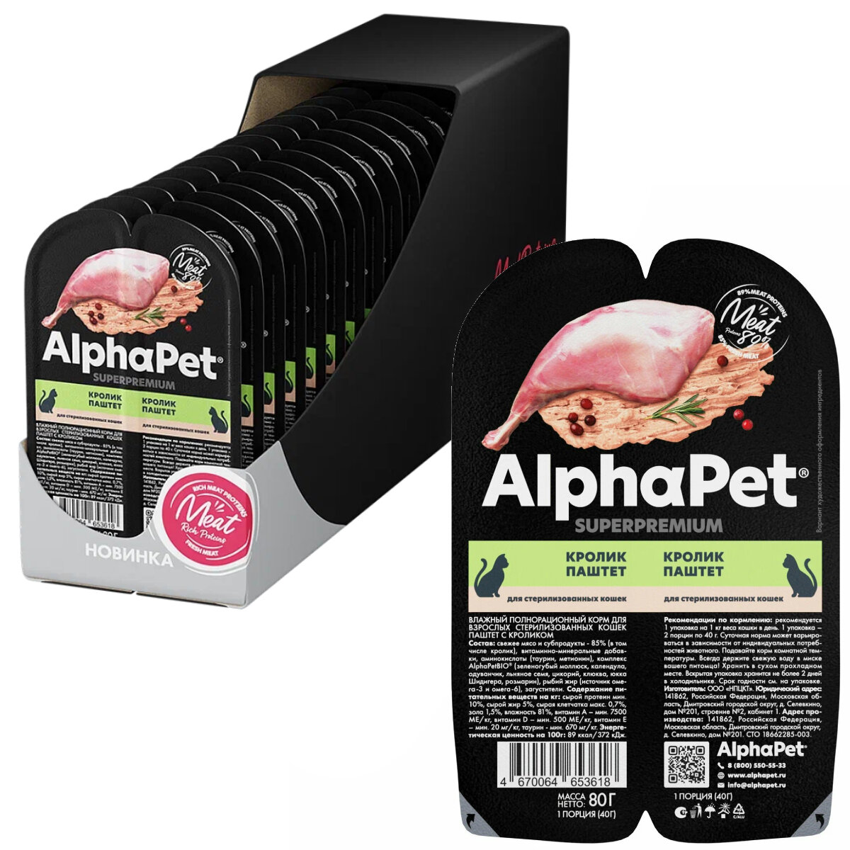 Влажный корм AlphaPet Superpremium для взрослых стерилизованных кошек паштет с кроликом, 15 шт по 80гр