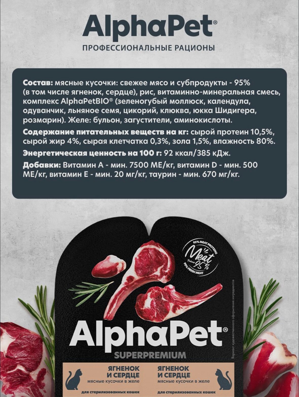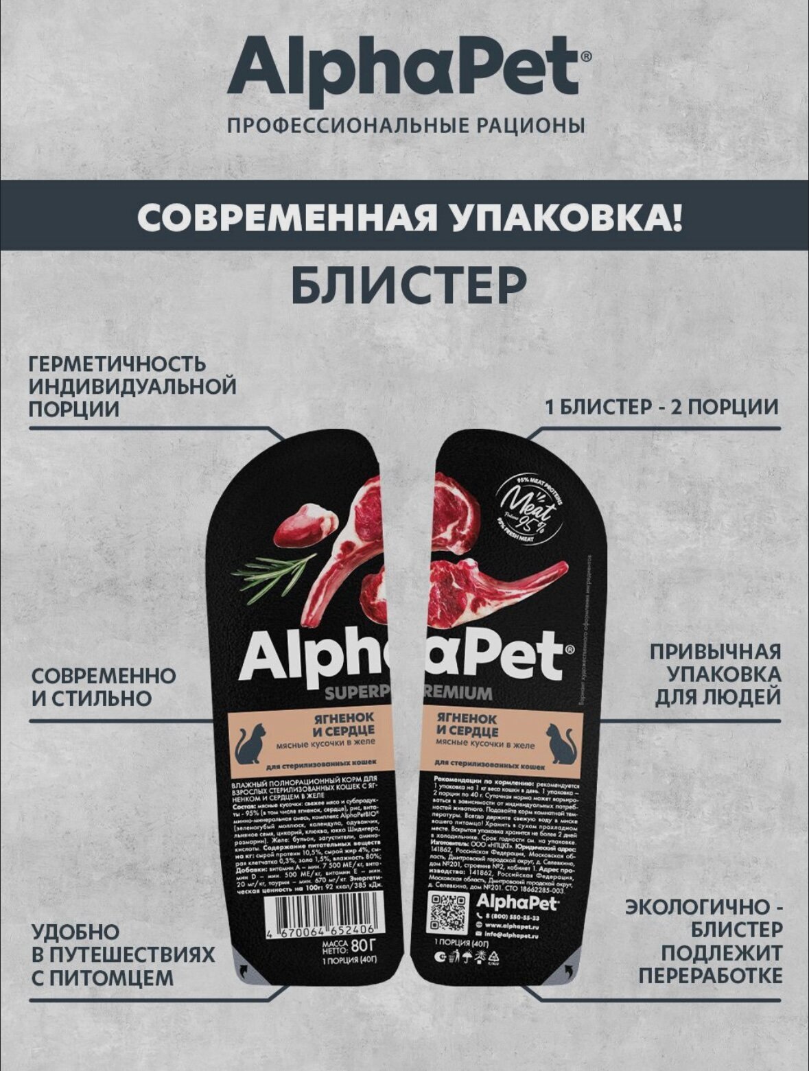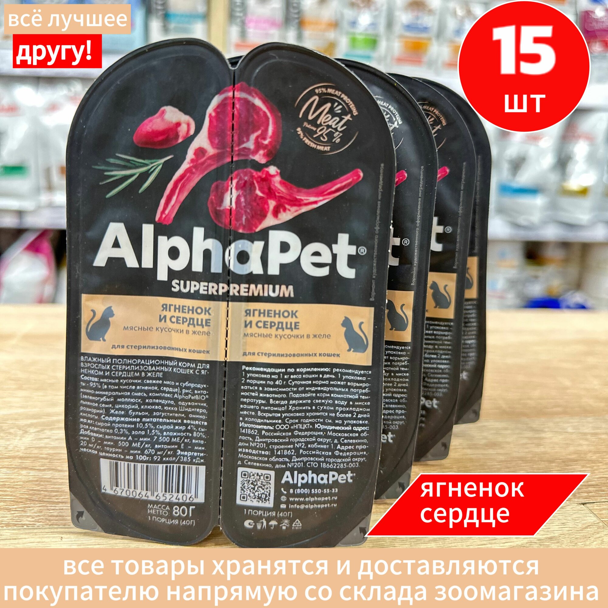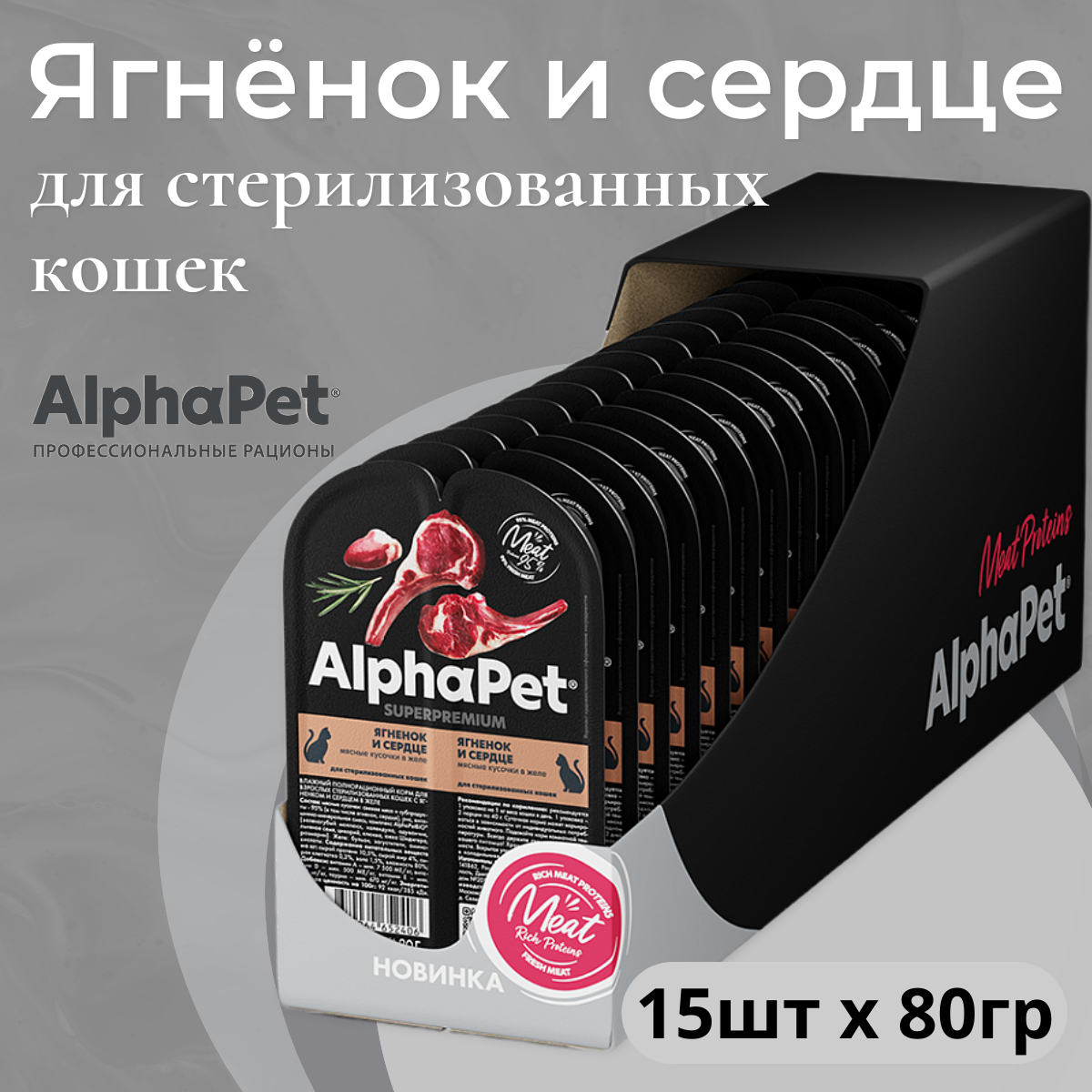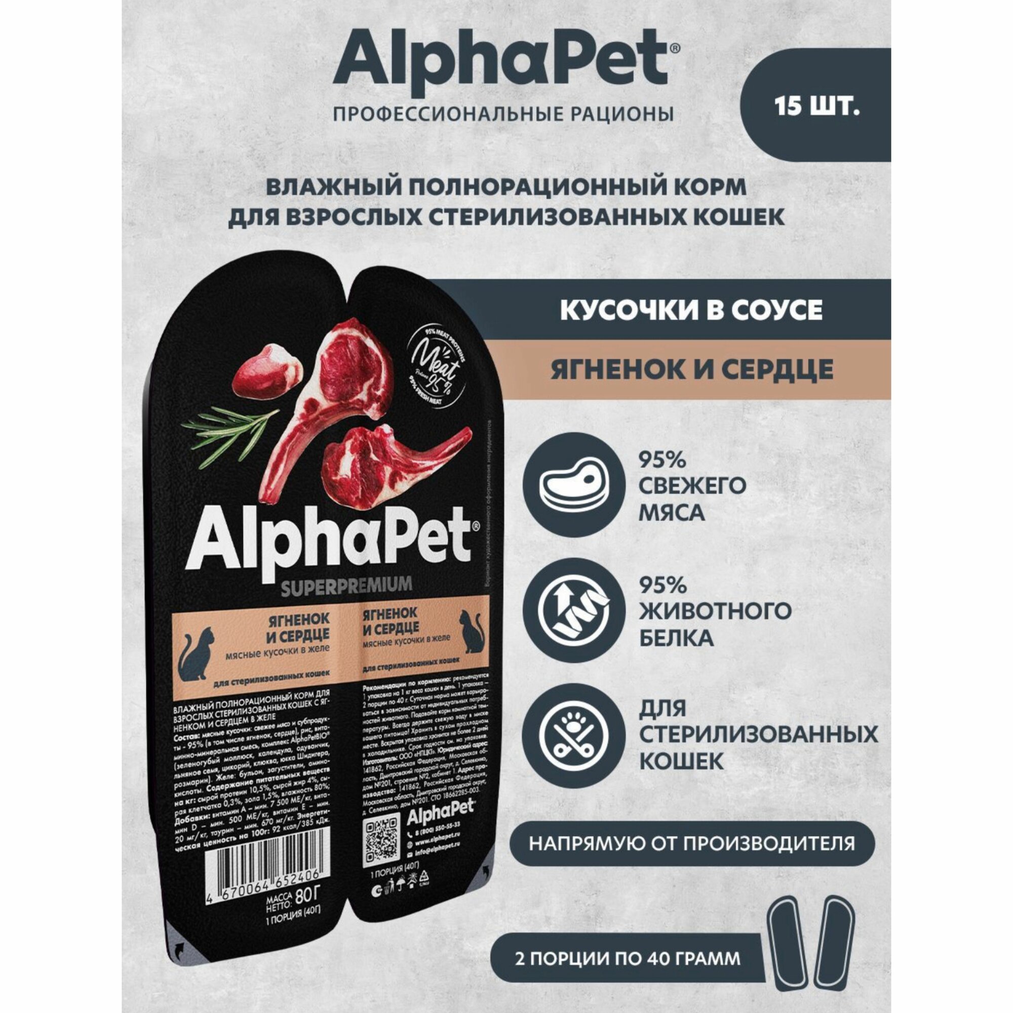 Купить Влажный полнорационный корм для взрослых стерилизованных кошек AlphaPet Superpremium, Ягненок и сердце мясные кусочки в желе, 80г * 15шт
