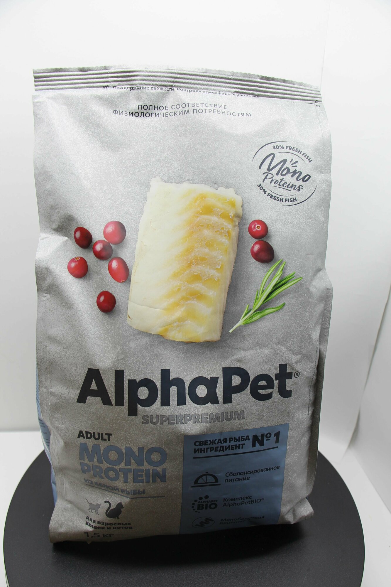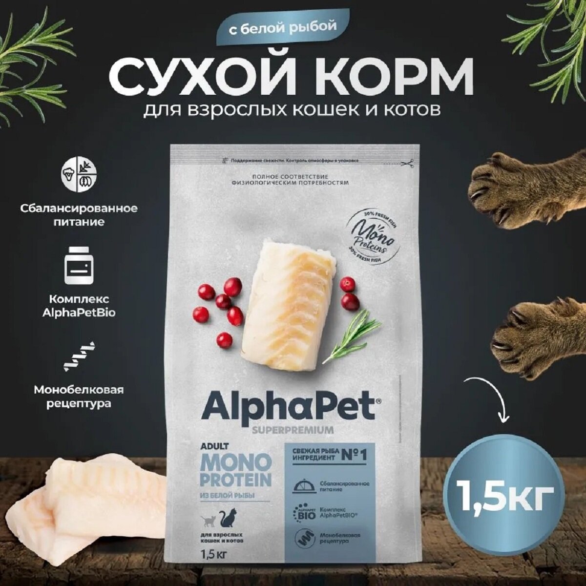 Купить Сухой полнорационный корм MONOPROTEIN из белой рыбы для взрослых кошек AlphaPet Superpremium 1,5 кг