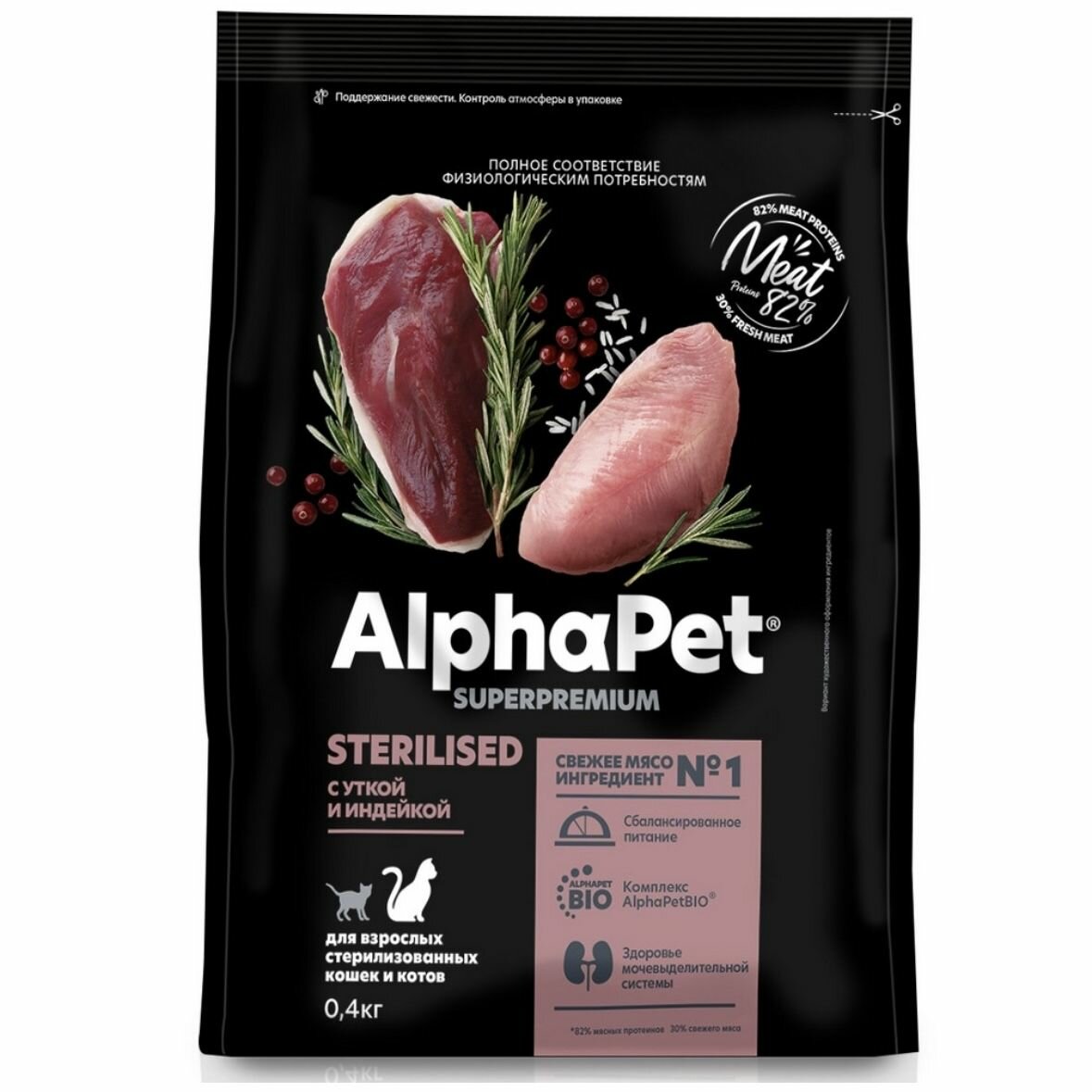 AlphaPet Superpremium / Сухой полнорационный корм с уткой и индейкой для взрослых стерилизованных кошек и котов 400гр