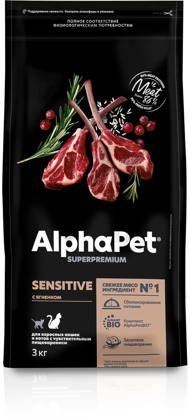 Купить Сухой корм для кошек AlphaPet Superpremium полнорационный с чувствительным пищеварением с ягненком, 3 кг