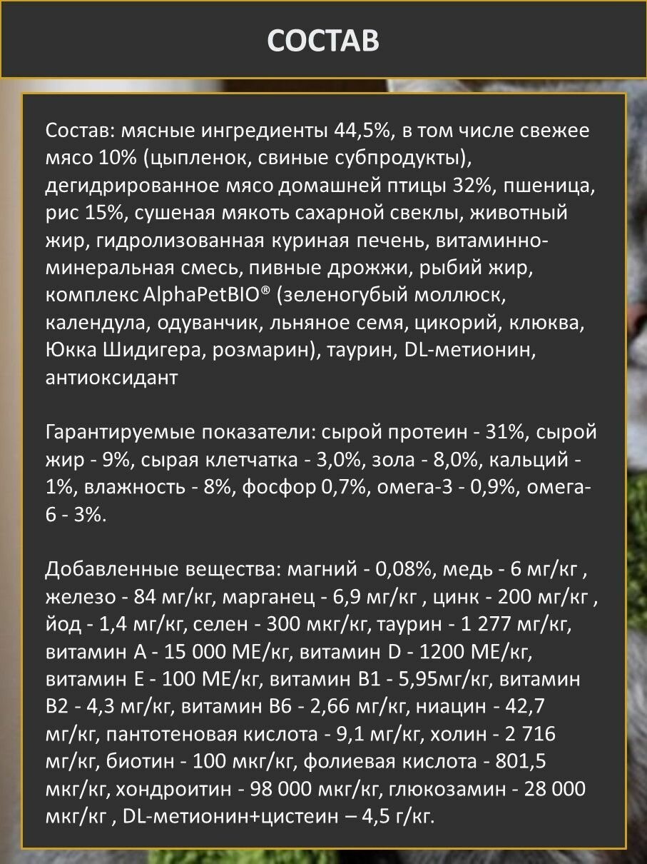 | Состав | свежее мясо 30% (ягненок, индейка, курица), дегидрированное мясо домашней птицы 19%, рис 15%, ячмень, овес, гидролизованная куриная печень, животный жир, желтый горошек, витаминно-минеральная смесь, сушеная мякоть сахарной свеклы, пивные дрожжи, комплекс AlphaPetBIO® (зеленогубый моллюск, календула, одуванчик, льняное семя, цикорий, клюква, Юкка Шидигера, розмарин), рыбий жир, таурин, DL- метионин, антиоксидант |