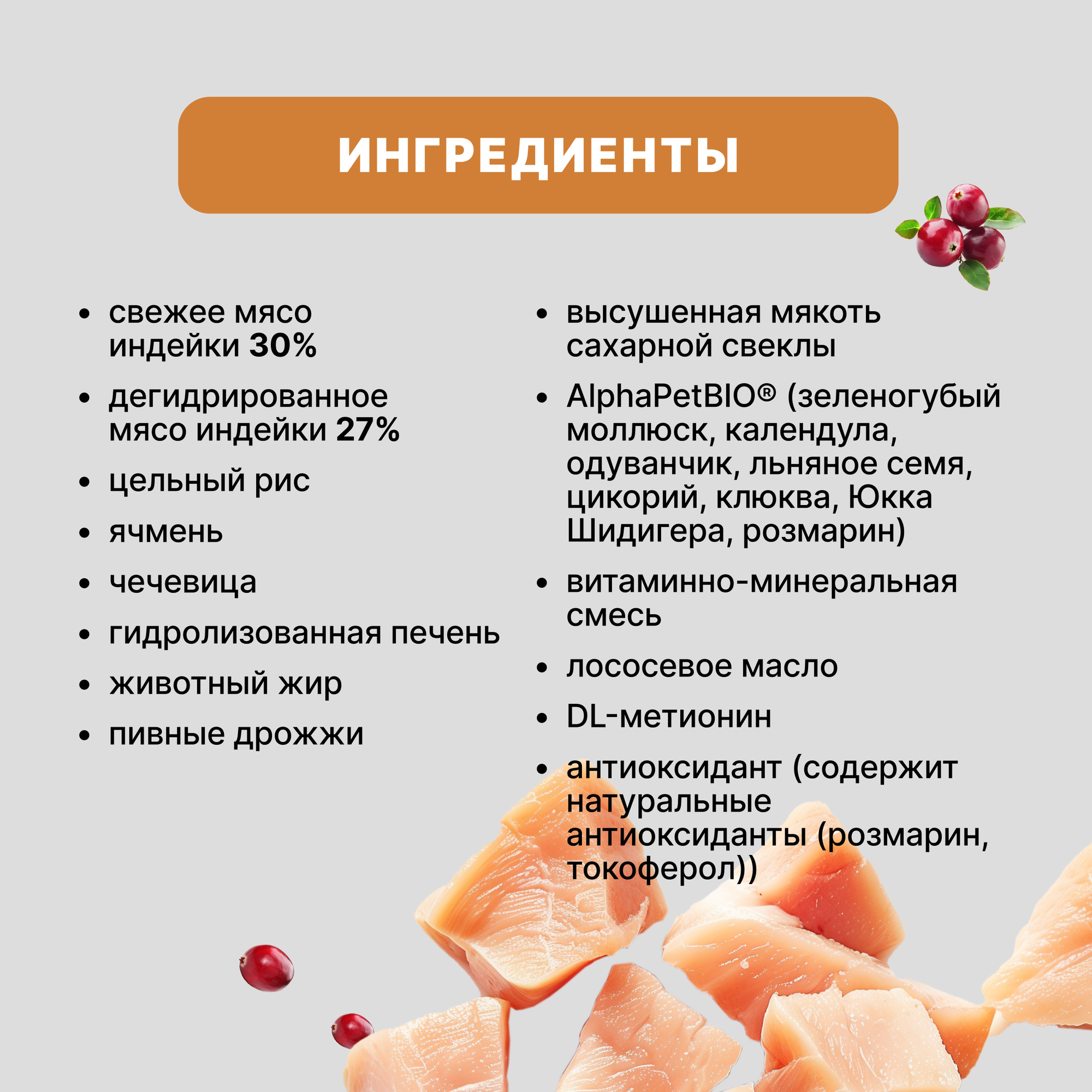 | Состав | свежее мясо 30% (ягненок, индейка, курица), дегидрированное мясо домашней птицы 19%, рис 15%, ячмень, овес, гидролизованная куриная печень, животный жир, желтый горошек, витаминно-минеральная смесь, сушеная мякоть сахарной свеклы, пивные дрожжи, комплекс AlphaPetBIO® (зеленогубый моллюск, календула, одуванчик, льняное семя, цикорий, клюква, Юкка Шидигера, розмарин), рыбий жир, таурин, DL- метионин, антиоксидант |
