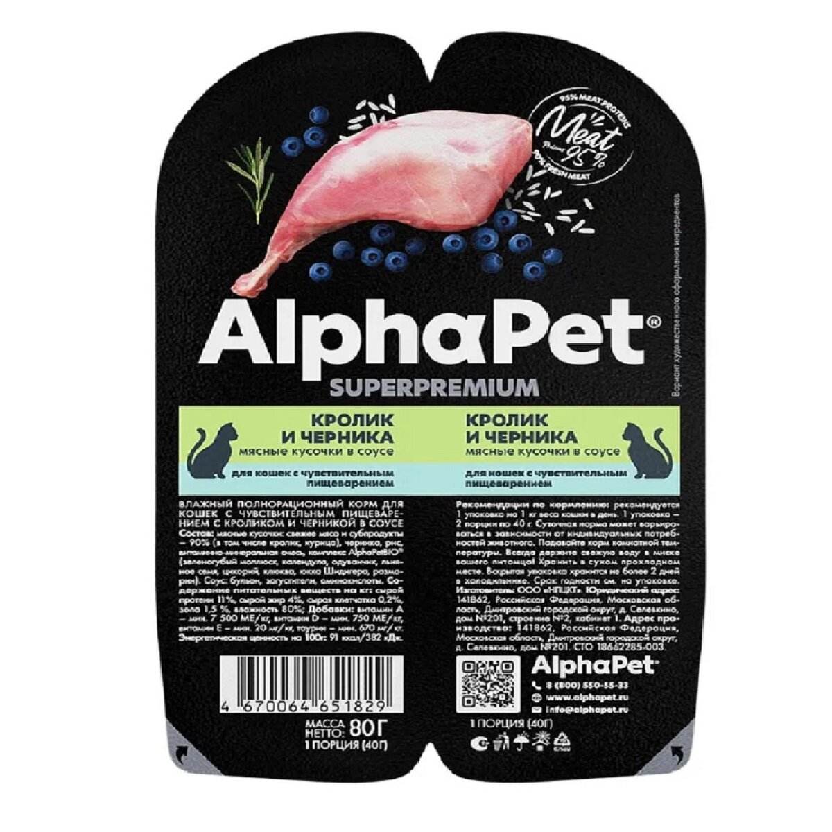 Купить AlphaPet Superpremium паучи для кошек с чувствительным пищеварением кусочки в соусе Кролик и черника 80г (15 штук)