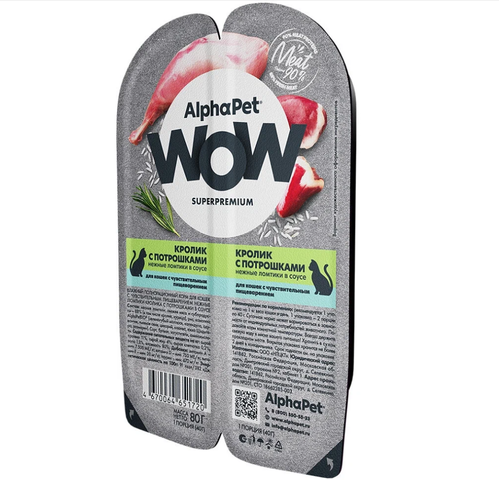 Купить AlphaPet WOW 15шт по 80г корм для кошек c чувствительным пищеварением, кролик с потрошками сочные ломтики в соусе