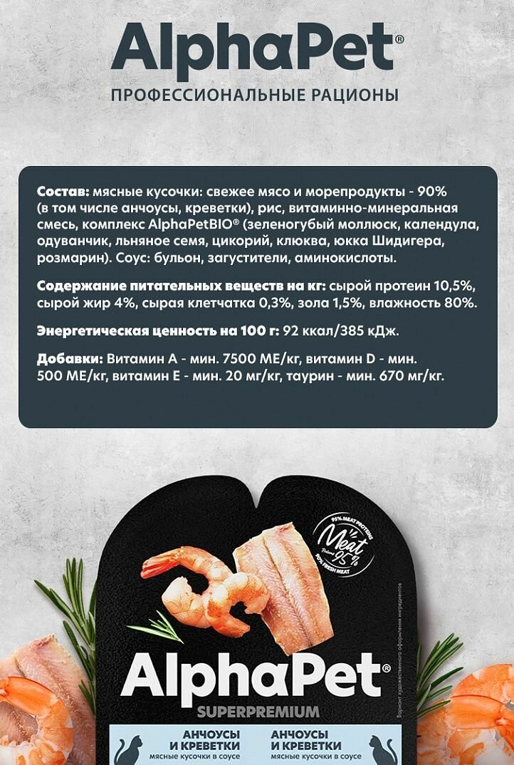 Купить Влажный полнорационный корм холистик для взрослых стерилизованных кошек AlphaPet Superpremium Анчоусы и креветки мясные кусочки в соусе 80 гр х 15 шт