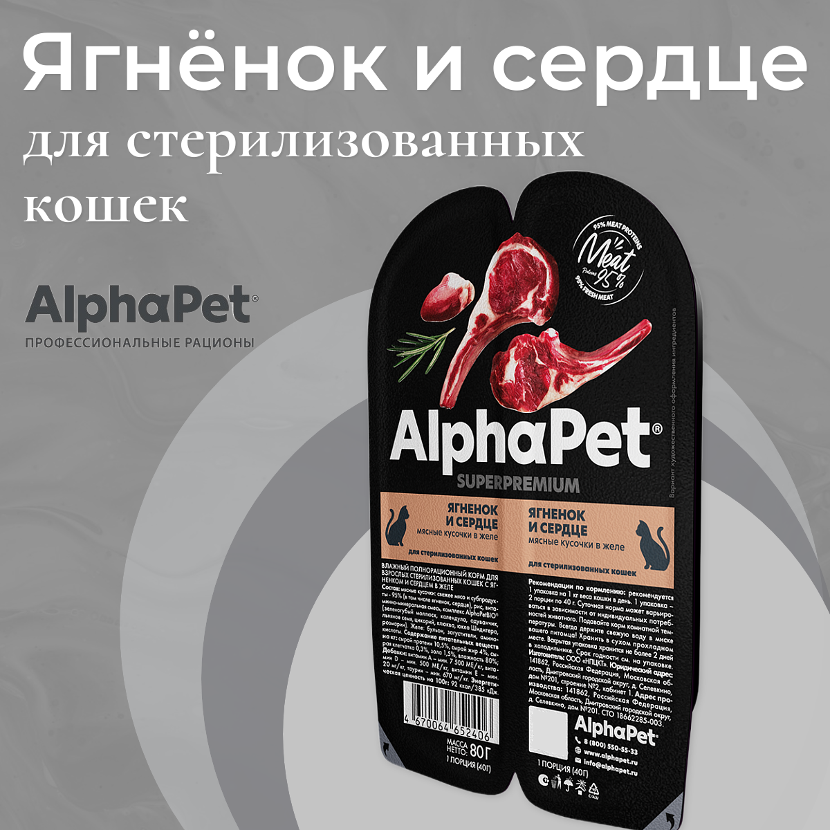 Влажный полнорационный корм для взрослых стерилизованных кошек AlphaPet Superpremium, Ягненок и сердце мясные кусочки в желе, 80г * 15шт
