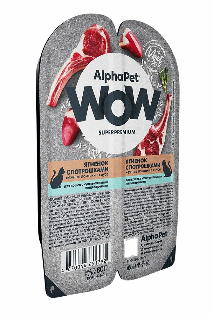 Купить Влажный (консервированный) корм AlphaPet (АльфаПет) WOW для взрослых кошек - Ягненок с потрошками (ломтики в соусе, 15шт по 80гр)