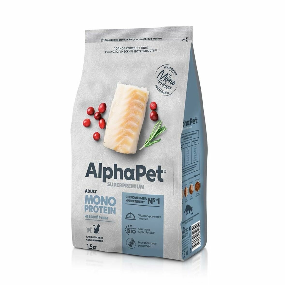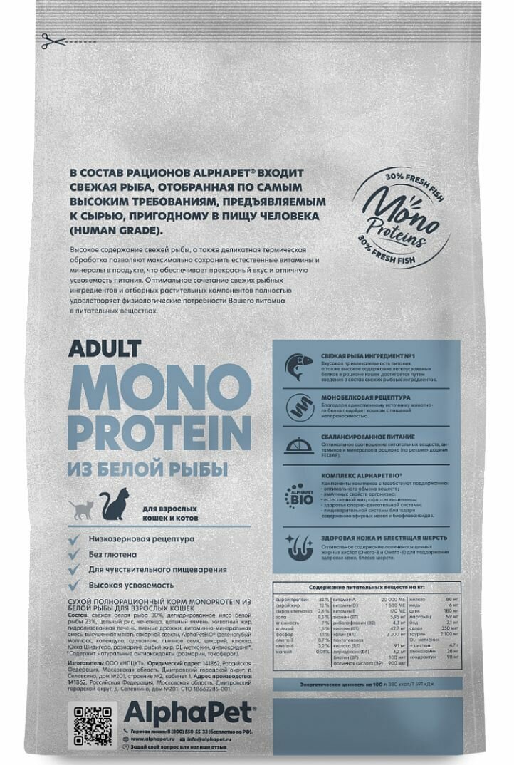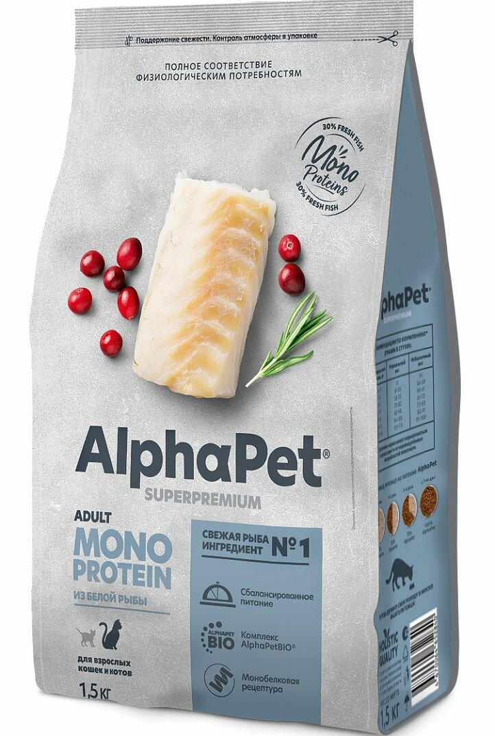 Сухой полнорационный корм MONOPROTEIN из белой рыбы для взрослых кошек AlphaPet Superpremium 1,5 кг