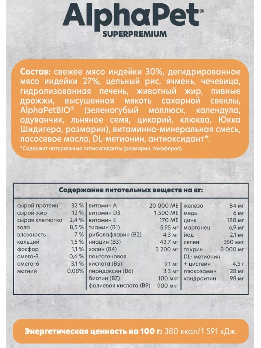 | Состав | свежее мясо 30% (ягненок, индейка, курица), дегидрированное мясо домашней птицы 19%, рис 15%, ячмень, овес, гидролизованная куриная печень, животный жир, желтый горошек, витаминно-минеральная смесь, сушеная мякоть сахарной свеклы, пивные дрожжи, комплекс AlphaPetBIO® (зеленогубый моллюск, календула, одуванчик, льняное семя, цикорий, клюква, Юкка Шидигера, розмарин), рыбий жир, таурин, DL- метионин, антиоксидант |