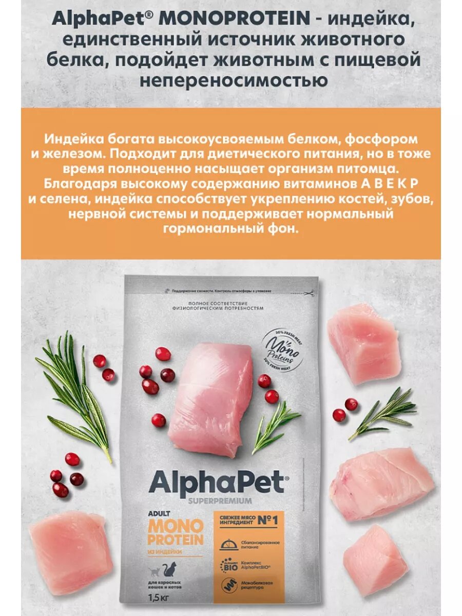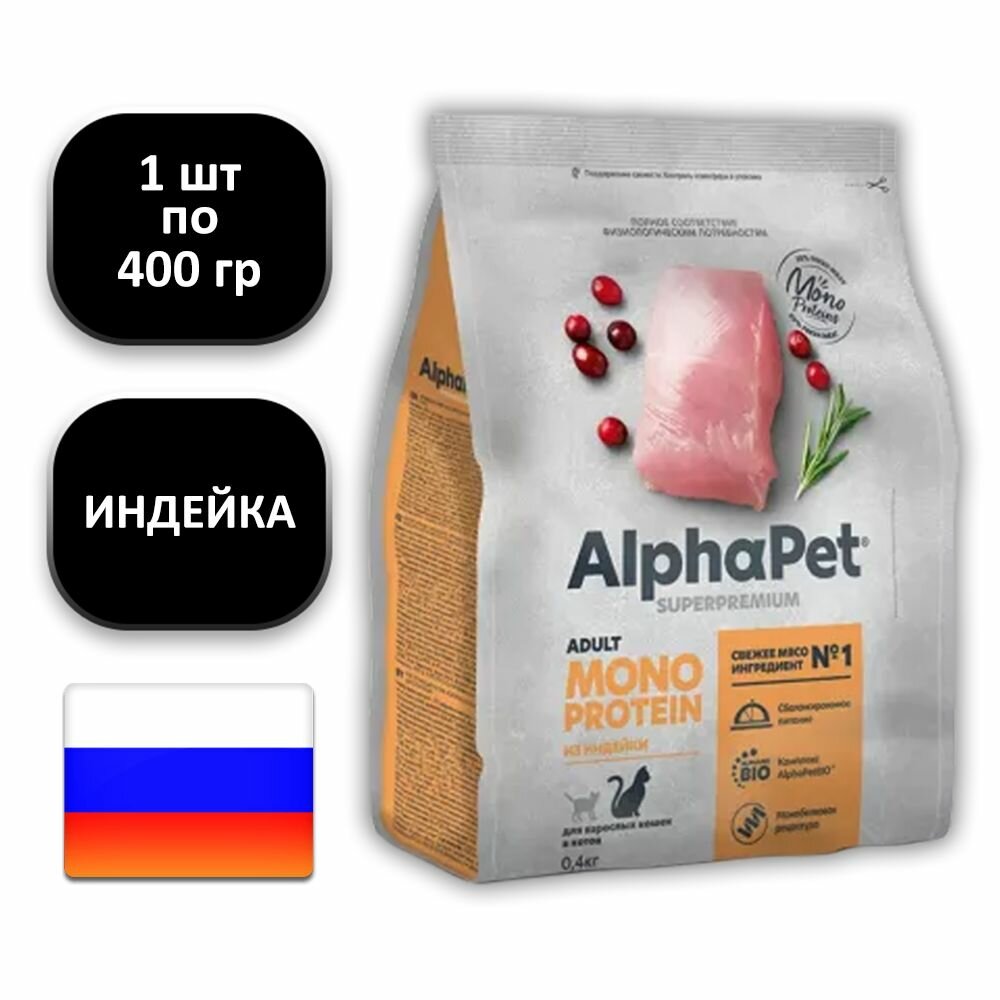 Купить AlphaPet Monoprotein Superpremium Сухой корм для взрослых кошек, с индейкой, 400 гр.