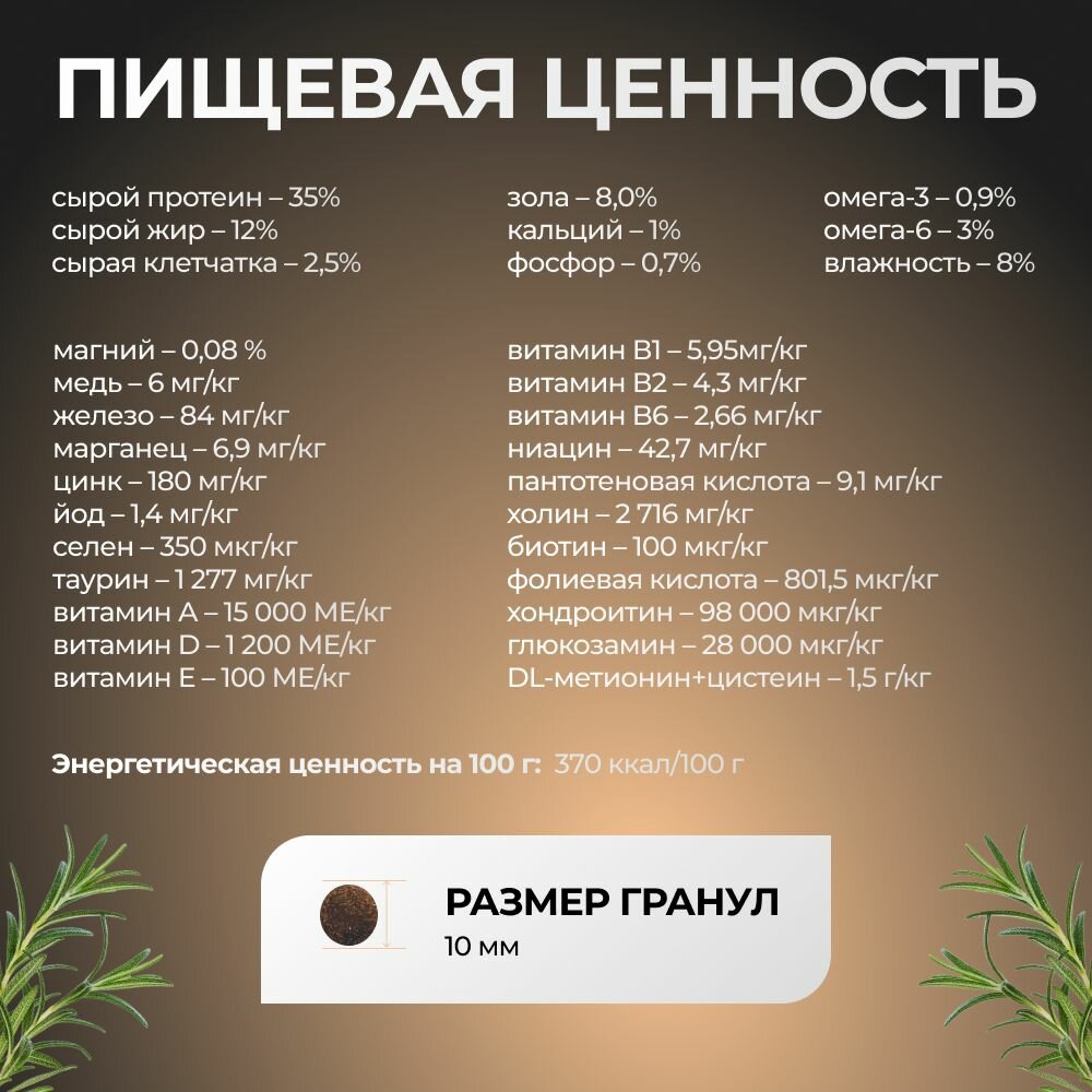 | Пищевая ценность | сырой протеин - 35%, сырой жир - 12%, сырая клетчатка - 2,5%, зола - 8%, кальций - 1%, фосфор - 0,7%, омега 3 - 0,9%, омега 6 - 3%, влажность - 8% |