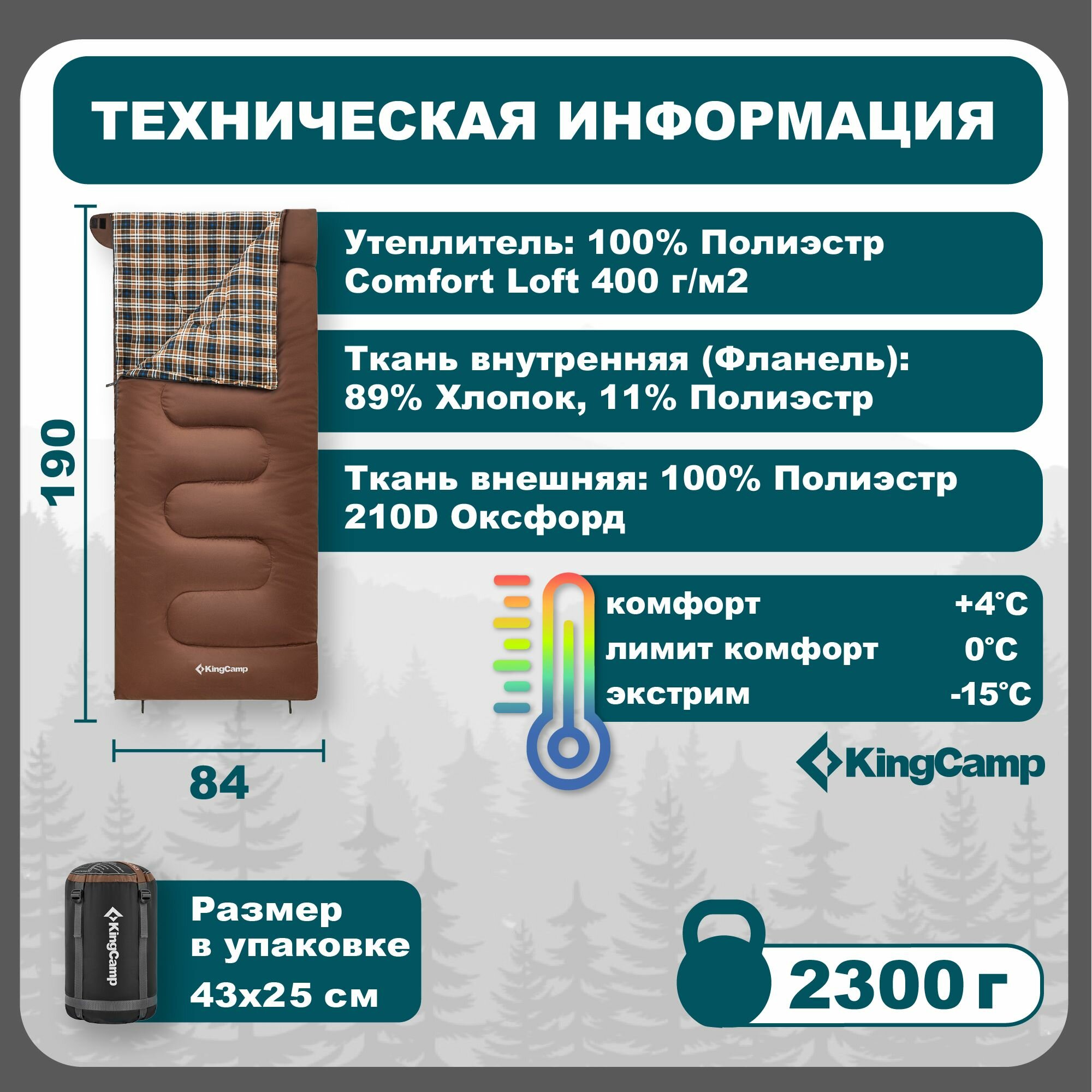 Спальный мешок King Camp 2215 SNOWFLAKE 400 -15С, 190х84 см, правая молния